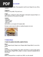 Blatul 8 albuuri se bat spum cu dou linguri ap i 10 linguri zahr. Cnd sunt btute, se adaug glbenuurile frecate cu puin praf de copt, 2 linguri de cacao i 8 linguri fin. Se pune la cuptor. Cnd este rece se taie n buci de 8/8 cm. Siropul Un litru ap, o esen rom, 10 linguri zahr se fierb pe foc. Cnd este rcit siropul se nmoaie picotul n sirop i se stoarce s nu fie prea nsiropat. Crema Ai nevoie de:1 kg frisc, 8 ou, 350 gr zahr, 350 ml lapte, 2 plicuri gelatin, 2 plicuri ntritor de fric, 2 portocale, 3-4 kiwi, 100 gr viine compot fr smburi. (fructe se pot pune la alegere) Cum procedezi 8 ou ntregi, 350 gr zahr, 350 ml lapte se fierb pe [Link] a fiert se pun 2 plicuri gelatin dizolvat n puin ap, i se ia de pe aburi. Dup aceea se bate frica cu 2 plicuri ntritor. Cnd este btut frica, se pune pe rnd crema de mai sus. ntr-o crati de 6 l se pune o folie de celofan udat bine cu ap. Pe urm se aranjaz fructele, frica i picoturile. Se repet nc o dat, fructe, fric, picoturi. Cnd este gata se strnge celofanul bine s se aeze blatul i frica, i se pune la congelator pn a doua zi. A doua zi se i-a din celofan se ntoarce sus-jos i se asaz pe tav.