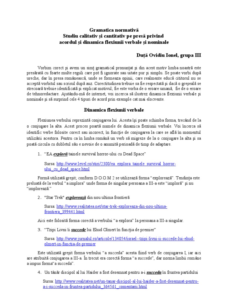Gramatica normativ Studiu calitativ i cantitativ pe pres privind acordul i dinamica flexiunii verbale i nominale Du Ovidiu Ionel, grupa