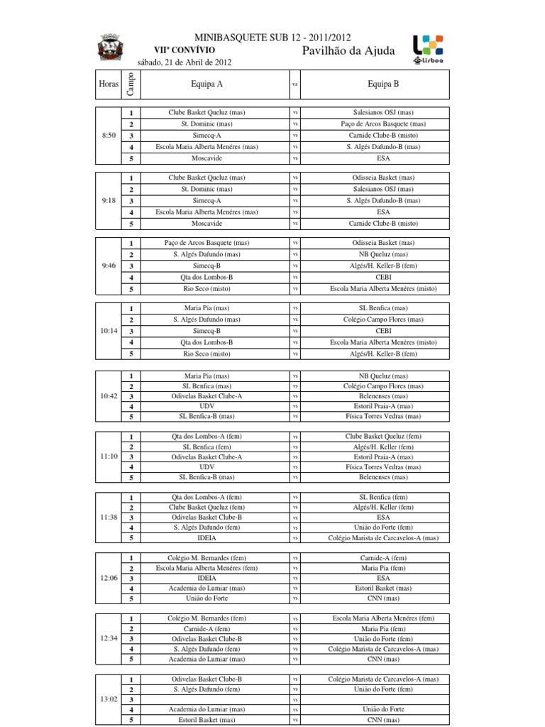 Clube Basket Queluz (mas) St. Dominic (mas) Simecq-A Escola Maria Alberta Menres (mas) Moscavide Clube Basket Queluz (mas) St. Dominic (mas) Simecq-A Escola Maria Alberta Menres (mas) Moscavide Pao de Arcos Basquete (mas) S. Algs Dafundo (mas) Simecq-B Qta dos Lombos-B Rio Seco (misto) Maria Pia (mas) S. Algs Dafundo (mas) Simecq-B Qta dos Lombos-B Rio Seco (misto) Maria Pia (mas) SL Benfica (mas) Odivelas Basket Clube-A UDV SL Benfica-B (mas) Qta dos Lombos-A (fem) SL Benfica (fem) Odivelas Basket Clube-A UDV SL Benfica-B (mas) Qta dos Lombos-A (fem) Clube Basket Queluz (fem) Odivelas Basket Clube-B S. Algs Dafundo (fem) IDEIA Colgio M. Bernardes (fem) Escola Maria Alberta Menres (fem) IDEIA Academia do Lumiar (mas) Unio do Forte Colgio M. Bernardes (fem) Carnide-A (fem) Odivelas Basket Clube-B S. Algs Dafundo (fem) Academia do Lumiar (mas) Odivelas Basket Clube-B S. Algs Dafundo (fem) Academia do Lumiar (mas) Estoril Basket (mas)