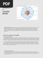 n anul 1913 apare modelul atomic al lui Bohr. Acest model preia modelul planetar al lui Rutherford i i aplic teoria cuantelor. Modelul lui Bohr este aplicabil ionilor hidrogenoizi (He+, Li+2, Be+3, etc, adic ionii care au un singur electron n cmpul de sarcin efectiv al nucleului) Modelul atomic al lui Bohr se bazeaz pe dou postulate: 1) Primul postulat se refer la orbitele atomice i presupune c electronul se rotete n jurul nucleului fr a emite sau a absorbi energie radiant numai pe anumite orbite circulare, permise, staionare. Electronul se menine pe orbit datorit compensrii forei centrifuge cu fora de atracie Coulombian. 2) Al doilea postulat emis de Bohr se refer la faptul c, n micarea sa pe orbita permis, electronul nu emite i nici nu absoarbe energie radiant ntr-un spectru continuu de frecven, ci numai discontinuu, corespunznd unor tranziii electronice, care duc n final la liniile spectrale. Acest model nu poate explica spectrele de emisie i energia de ionizare dect pentru atomul de hidrogen i ionii hidrogenoizi.