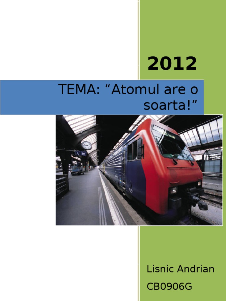 Celebrul fizician Richard Feynman spunea ca, daca toata cuceririle stiintifice ale umanitatii ar fi la un moment dat in pericol de a disparea, el nu le-ar spune urmasilor decat un singur lucru: "Totul este zamislit din atomi". De fapt, cu adevarat remarcabila este tocmai fascinanta calatorie a omenirii in adancurile materiei pentru a cunoaste secretele atomului - acest obiect invizibil care se afla la temelia realitatii Universului si care fundamenteaza acum intreaga fizica, chimie si biologie. O calatorie departe de a fi ajuns la final. 400 [Link]. Filosoful grec Democrit dezvolta prima teorie atomica. El spune ca intreaga materie este alcatuita din particule micute, eterne, imuabile si indestructibile. Democrit a inventat termenul atom, derivat din grecescul atomos, adica indivizibil. Desi bazate pe simple intuitii, ideile filosofului s-au dovedit a fi remarcabil de corecte. 1803 Chimistul britanic John Dalton reinvie ideea lui Democrit conform careia atomii reprezinta caramizile fundamentale ale materiei. Totusi, teoria atomica a lui Dalton se bazeaza mai curand pe un secol si jumatate de experimente chimice, decat pe simpla gandire filosofica. 1815 In cadrul unei ipoteze indraznete, chimistul britanic William Prout avanseaza ideea ca atomii tuturor elementelor sunt alcatuiti din multimi variabile de atomi de hidrogen.