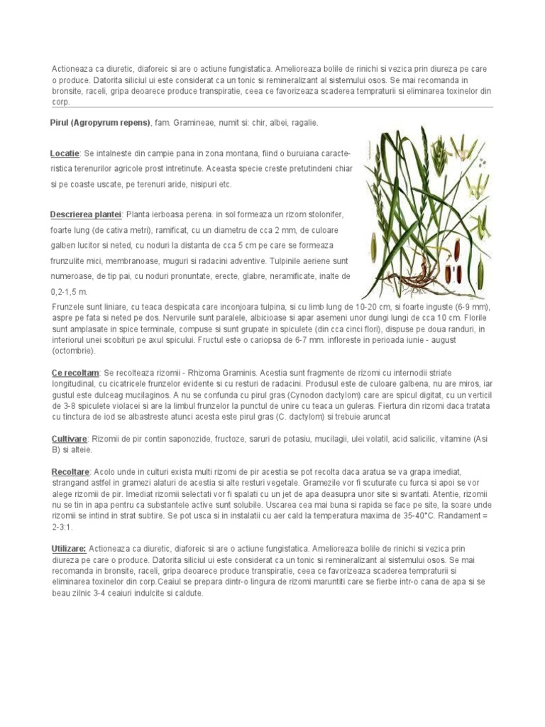 Descrierea plantei: Planta ierboasa perena. in sol formeaza un rizom stolonifer, foarte lung (de cativa metri), ramificat, cu un diametru de cca 2 mm, de culoare galben lucitor si neted, cu noduri la distanta de cca 5 cm pe care se formeaza frunzulite mici, membranoase, muguri si radacini adventive. Tulpinile aeriene sunt numeroase, de tip pai, cu noduri pronuntate, erecte, glabre, neramificate, inalte de 0,2-1,5 m. Frunzele sunt liniare, cu teaca despicata care inconjoara tulpina, si cu limb lung de 10-20 cm, si foarte inguste (6-9 mm), aspre pe fata si neted pe dos. Nervurile sunt paralele, albicioase si apar asemeni unor dungi lungi de cca 10 cm. Florile sunt amplasate in spice terminale, compuse si sunt grupate in spiculete (din cca cinci flori), dispuse pe doua randuri, in interiorul unei scobituri pe axul spicului. Fructul este o cariopsa de 6-7 mm. infloreste in perioada iunie - august (octombrie). Ce recoltam: Se recolteaza rizomii - Rhizoma Graminis. Acestia sunt fragmente de rizomi cu internodii striate longitudinal, cu cicatricele frunzelor evidente si cu resturi de radacini. Produsul este de culoare galbena, nu are miros, iar gustul este dulceag mucilaginos. A nu se confunda cu pirul gras (Cynodon dactylom) care are spicul digitat, cu un verticil de 3-8 spiculete violacei si are la limbul frunzelor la punctul de unire cu teaca un guleras. Fiertura din rizomi daca tratata cu tinctura de iod se albastreste atunci acesta este pirul gras (C. dactylom) si trebuie aruncat Cultivare: Rizomii de pir contin saponozide, fructoze, saruri de potasiu, mucilagii, ulei volatil, acid salicilic, vitamine (Asi B) si alteie. Recoltare: Acolo unde in culturi exista multi rizomi de pir acestia se pot recolta daca aratua se va grapa imediat, strangand astfel in gramezi alaturi de acestia si alte resturi vegetale. Gramezile vor fi scuturate cu furca si apoi se vor alege rizomii de pir. Imediat rizomii selectati vor fi spalati cu un jet de apa deasupra unor site si svantati. Atentie, rizomii nu se tin in apa pentru ca substantele active sunt solubile. Uscarea cea mai buna si rapida se face pe site, la soare unde rizomii se intind in strat subtire. Se pot usca si in instalatii cu aer cald la temperatura maxima de 35-40C. Randament = 2-3:1. Utilizare: Actioneaza ca diuretic, diaforeic si are o actiune fungistatica. Amelioreaza bolile de rinichi si vezica prin diureza pe care o produce. Datorita siliciul ui este considerat ca un tonic si remineralizant al sistemului osos. Se mai recomanda in bronsite, raceli, gripa deoarece produce transpiratie, ceea ce favorizeaza scaderea tempraturii si eliminarea toxinelor din [Link] se prepara dintr-o lingura de rizomi maruntiti care se fierbe intr-o cana de apa si se beau zilnic 3-4 ceaiuri indulcite si caldute.