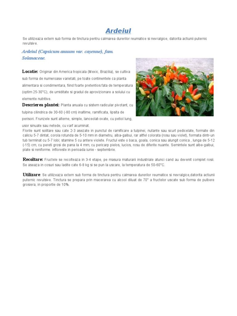 Ardeiul (Capsicum anuum var. cayenne), fam. Solanaceae. Locatie: Originar din America tropicala (Mexic, Brazilia), se cultiva