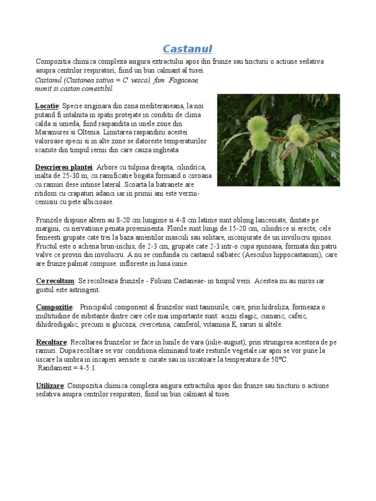Compozitia chimica complexa asigura extractului apos din frunze sau tincturii o actiune sedativa asupra centrilor respiratori, fiind un bun calmant al tusei. Castanul (Castanea sativa = C. vesca), fam. Fagaceae, numit si castan comestibil. Locatie: Specie originara din zona mediteraneana, la noi putand fi intalnita in spatii protejate in conditii de clima calda si umeda, fiind raspandita in unele zone din Maramures si Oltenia. Limitarea raspandirii acestei valoroase specii si in alte zone se datoreste temperaturilor scazute din timpul iernii din care cauza ingheata. Descrierea plantei: Arbore cu tulpina dreapta, cilindrica, inalta de 25-30 m, cu ramificatie bogata formand o coroana cu ramuri dese intinse lateral. Scoarta la batranete are ritidom cu crapaturi adanci iar in primii ani este verzuicenusiu cu pete albicioase. Frunzele dispune altern au 8-20 cm lungime si 4-8 cm latime sunt oblong lanceoiate, dintate pe margini, cu nervatiune penata proeminenta. Florile sunt lungi de 15-20 cm, cilindrice si erecte, cele femeesti grupate cate trei la baza amentilor masculi sau solitare, inconjurate de un involucru spinos. Fructul este o achena brun-inchis, de 2-3 cm, grupate cate 2-3 intr-o cupa spinoasa, formata din patru valve ce provin din involucru. A nu se confunda cu castanul salbatec (Aesculus hippocastanum), care are frunze palmat compuse. infloreste in luna iunie. Ce recoltam: Se recolteaza frunzele - Folium Castaneae- in timpul verii. Acestea nu au miros iar gustul este astringent. Compozitie: Principalul component al frunzelor sunt taninurile, care, prin hidroliza, formeaza o multitudine de substante dintre care cele mai importante sunt: acizii elagic, cumaric, cafeic, dihidrodigalic, precum si glucoza, cvercetina, camferol, vitamina E, saruri si altele. Recoltare: Recoltarea frunzelor se face in lunile de vara (iulie-august), prin strungirea acestora de pe ramuri. Dupa recoltare se vor conditiona eliminand toate resturile vegetale iar apoi se vor pune la uscare la umbra in incaperi aerisite si curate sau in uscatoare la temperatura de 50C. Randament = 4-5:1. Utilizare: Compozitia chimica complexa asigura extractului apos din frunze sau tincturii o actiune sedativa asupra centrilor respiratori, fiind un bun calmant al tusei.