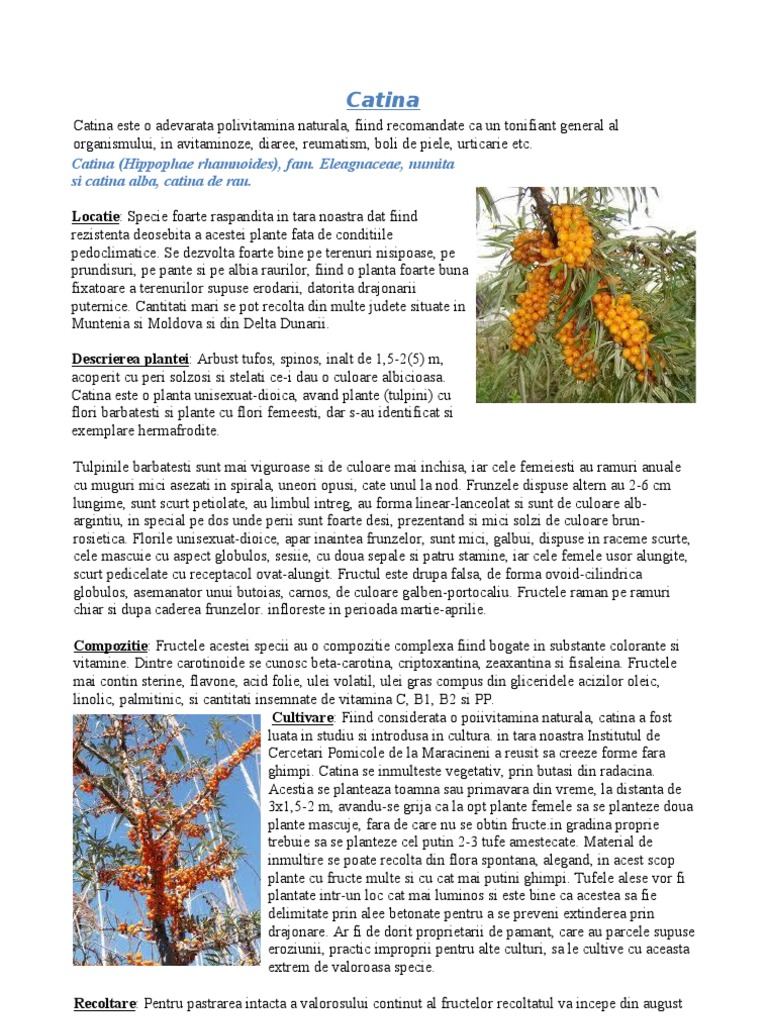 Catina este o adevarata polivitamina naturala, fiind recomandate ca un tonifiant general al organismului, in avitaminoze, diaree, reumatism, boli de piele, urticarie etc. Catina (Hippophae rhamnoides), fam. Eleagnaceae, numita si catina alba, catina de rau. Locatie: Specie foarte raspandita in tara noastra dat fiind rezistenta deosebita a acestei plante fata de conditiile pedoclimatice. Se dezvolta foarte bine pe terenuri nisipoase, pe prundisuri, pe pante si pe albia raurilor, fiind o planta foarte buna fixatoare a terenurilor supuse erodarii, datorita drajonarii puternice. Cantitati mari se pot recolta din multe judete situate in Muntenia si Moldova si din Delta Dunarii. Descrierea plantei: Arbust tufos, spinos, inalt de 1,5-2(5) m, acoperit cu peri solzosi si stelati ce-i dau o culoare albicioasa. Catina este o planta unisexuat-dioica, avand plante (tulpini) cu flori barbatesti si plante cu flori femeesti, dar s-au identificat si exemplare hermafrodite. Tulpinile barbatesti sunt mai viguroase si de culoare mai inchisa, iar cele femeiesti au ramuri anuale cu muguri mici asezati in spirala, uneori opusi, cate unul la nod. Frunzele dispuse altern au 2-6 cm lungime, sunt scurt petiolate, au limbul intreg, au forma linear-lanceolat si sunt de culoare albargintiu, in special pe dos unde perii sunt foarte desi, prezentand si mici solzi de culoare brunrosietica. Florile unisexuat-dioice, apar inaintea frunzelor, sunt mici, galbui, dispuse in raceme scurte, cele mascuie cu aspect globulos, sesiie, cu doua sepale si patru stamine, iar cele femele usor alungite, scurt pedicelate cu receptacol ovat-alungit. Fructul este drupa falsa, de forma ovoid-cilindrica globulos, asemanator unui butoias, carnos, de culoare galben-portocaliu. Fructele raman pe ramuri chiar si dupa caderea frunzelor. infloreste in perioada martie-aprilie. Compozitie: Fructele acestei specii au o compozitie complexa fiind bogate in substante colorante si vitamine. Dintre carotinoide se cunosc beta-carotina, criptoxantina, zeaxantina si fisaleina. Fructele mai contin sterine, flavone, acid folie, ulei volatil, ulei gras compus din gliceridele acizilor oleic, linolic, palmitinic, si cantitati insemnate de vitamina C, B1, B2 si PP. Cultivare: Fiind considerata o poiivitamina naturala, catina a fost luata in studiu si introdusa in cultura. in tara noastra Institutul de Cercetari Pomicole de la Maracineni a reusit sa creeze forme fara ghimpi. Catina se inmulteste vegetativ, prin butasi din radacina. Acestia se planteaza toamna sau primavara din vreme, la distanta de 3x1,5-2 m, avandu-se grija ca la opt plante femele sa se planteze doua plante mascuje, fara de care nu se obtin [Link] gradina proprie trebuie sa se planteze cel putin 2-3 tufe amestecate. Material de inmultire se poate recolta din flora spontana, alegand, in acest scop plante cu fructe multe si cu cat mai putini ghimpi. Tufele alese vor fi plantate intr-un loc cat mai luminos si este bine ca acestea sa fie delimitate prin alee betonate pentru a se preveni extinderea prin drajonare. Ar fi de dorit proprietarii de pamant, care au parcele supuse eroziunii, practic improprii pentru alte culturi, sa le cultive cu aceasta extrem de valoroasa specie. Recoltare: Pentru pastrarea intacta a valorosului continut al fructelor recoltatul va incepe din august