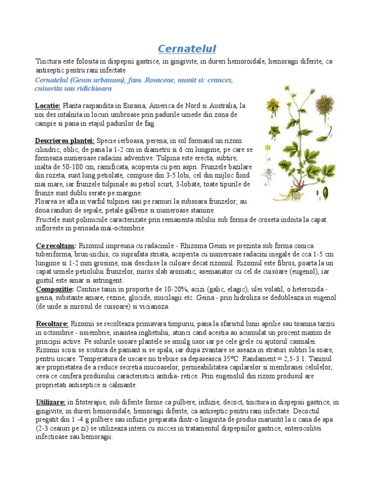 Tinctura este folosita in dispepsii gastrice, in gingivite, in dureri hemoroidale, hemoragii diferite, ca antiseptic pentru rani infectate Cernatelul (Geum urbanum), fam. Rosaceae, numit si: crances, cuisorita sau ridichioara Locatie: Planta raspandita in Eurasia, America de Nord si Australia, la noi des intalnita in locuri umbroase prin padurile umede din zona de campie si pana in etajul padurilor de fag. Descrierea plantei: Specie ierboasa, perena; in sol formand un rizom cilindric, oblic, de pana la 1-2 cm in diametru si 6 cm lungime, pe care se formeaza numeroase radacini adventive. Tulpina este erecta, subtire, inalta de 50-100 cm, ramificata, acoperita cu peri aspri. Frunzele bazilare din rozeta, sunt lung petiolate, compuse din 3-5 lobi, cel din mijloc fiind mai mare, iar frunzele tulpinale au petiol scurt, 3-lobate, toate tipurile de frunze sunt dublu serate pe margine. Floarea se afla in varful tulpinei sau pe ramuri la subsoara frunzelor; au doua randuri de sepale, petale galbene si numeroase stamine. Fructele sunt polinucule caracterizate prin remanenta stilului sub forma de croseta indoita la capat. infloreste in perioada mai-octombrie. Ce recoltam: Rizomul impreuna cu radacinile - Rhizoma Geum se prezinta sub forma conica tuberiforma, brun-inchis, cu suprafata striata, acoperita cu numeroase radacini inegale de cca 1-5 cm lungime si 1-2 mm grosime, mai deschise la culoare decat rizomul. Rizomul este fibros, poarta la un capat urmele petiolului frunzelor, miros slab aromatic, asemanator cu cel de cuisoare (eugenol), iar gustul este amar si astringent. Compozitie: Contine tanin in proportie de 10-20%, acizi (galic, elagic), ulei volatil, o heterozida geina, substante amare, rezine, glucide, mucilagii etc. Geina - prin hidroliza se dedubleaza in eugenol (de unde si mirosul de cuisoare) si vicianoza. Recoltare: Rizomii se recolteaza primavara timpuriu, pana la sfarsitul lunii aprilie sau toamna tarziu in octombrie - noiembrie, inaintea inghetului, atunci cand acestia au acumulat un procent maxim de principii active. Pe solurile usoare plantele se smulg usor iar pe cele grele cu ajutorul casmalei. Rizomii scosi se scutura de pamant si se spala, iar dupa zvantare se aseaza in straturi subtiri la soare, pentru uscare. Temperatura de uscare nu trebuie sa depaseasca 35C. Randament = 2,5-3:1. Taninul are proprietatea de a reduce secretia mucoaselor, permeabilitatea capilarelor si membranei celulelor, ceea ce confera produsului caracteristici antidia- retice. Prin eugenolul din rizom produsul are proprietati antiseptice si calmante. Utilizare: in fitoterapie, sub diferite forme ca pulbere, infuzie, decoct, tinctura in dispepsii gastrice, in gingivite, in dureri hemoroidale, hemoragii diferite, ca antiseptic pentru rani infectate. Decoctul pregatit din 1 -4 g pulbere sau infuzie preparata dintr-o lingurita de produs maruntit la o cana de apa (2-3 ceaiuri pe zi) se utilizeaza intern cu succes in tratamentul dispepsiilor gastrice, enterocolitei infectioase sau hemoragii.