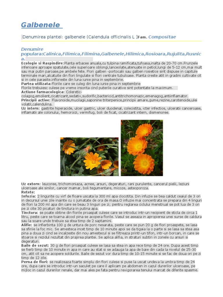 Ecologie si Raspindire:Planta erbacee anuala,cu tulpina ramificata,tufoasa,inalta de 20-70 [Link] inferioare aproape spatulate,cele superioare oblongi,lanceolate,atenuate in petiol,lungi de 5-12 cm,mai mult sau mai putin paroase,pe ambele fete. Flori galben -portocalii sau galben rosietice sint dispuse in capitule terminale mari,alcatuite din flori lingulate si flori centrale tubuloase. Planta creste atit in gradini cultivate cit si in cele [Link] din luna iunie pina in septembrie. Partea utilizata:Florile care se culeg din luna iunie pina in septembrie Florile trebuiesc culese pe vreme insorita cind puterile curative sint potentate la maximum. Actiune farmacologica: Colereticcolagog,emolient,cicatrizant,sedativ,sudorific,bactericid,antitrichomonazic,emenagog,antiinflamator. Principii active: Flavonoide,mucilagii,saponine triterpenice,principii amare,gume,rezine,carotenoide,ulei volatil,calendulina. Uz intern: gastrite hiperacide, ulcer gastric, ulcer duodenal, colecistita, icter infectios, ulceratii canceroase, inflamatii ale colonului, hemoroizi, vermifug, boli de ficat, cicatrizant intern, dismenoree.