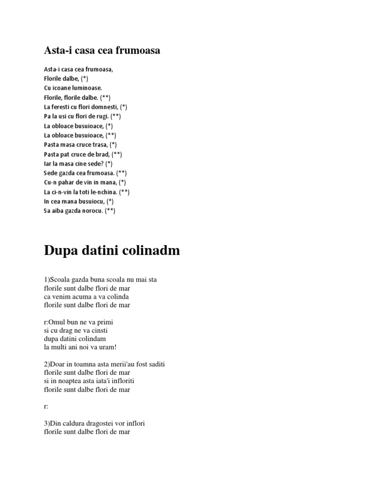 1)Scoala gazda buna scoala nu mai sta florile sunt dalbe flori de mar ca venim acuma a va colinda florile sunt dalbe flori de mar r:Omul bun ne va primi si cu drag ne va cinsti dupa datini colindam la multi ani noi va uram! 2)Doar in toamna asta merii'au fost saditi florile sunt dalbe flori de mar si in noaptea asta iata'i infloriti florile sunt dalbe flori de mar r: 3)Din caldura dragostei vor inflori florile sunt dalbe flori de mar