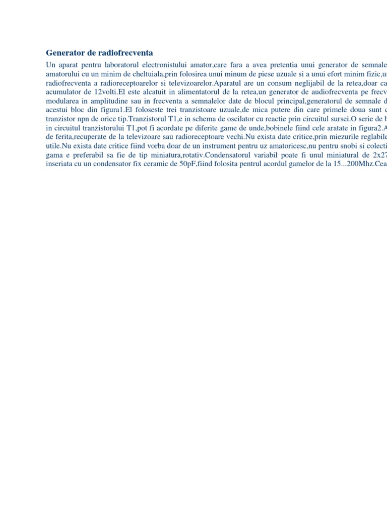 Un aparat pentru laboratorul electronistului amator,care fara a avea pretentia unui generator de semnale amatorului cu un minim de cheltuiala,prin folosirea unui minum de piese uzuale si a unui efort minim fizic,un radiofrecventa a radioreceptoarelor si [Link] are un consum neglijabil de la retea,doar ca acumulator de [Link] este alcatuit in alimentatorul de la retea,un generator de audiofrecventa pe frecv modularea in amplitudine sau in frecventa a semnalelor date de blocul principal,generatorul de semnale d acestui bloc din [Link] foloseste trei tranzistoare uzuale,de mica putere din care primele doua sunt c tranzistor npn de orice [Link] T1,e in schema de oscilator cu reactie prin circuitul sursei.O serie de b in circuitul tranzistorului T1,pot fi acordate pe diferite game de unde,bobinele fiind cele aratate in figura2.A de ferita,recuperate de la televizoare sau radioreceptoare [Link] exista date critice,prin miezurile reglabile [Link] exista date critice fiind vorba doar de un instrument pentru uz amatoricesc,nu pentru snobi si colecti gama e preferabil sa fie de tip miniatura,[Link] variabil poate fi unul miniatural de 2x27 inseriata cu un condensator fix ceramic de 50pF,fiind folosita pentrul acordul gamelor de la 15...[Link]