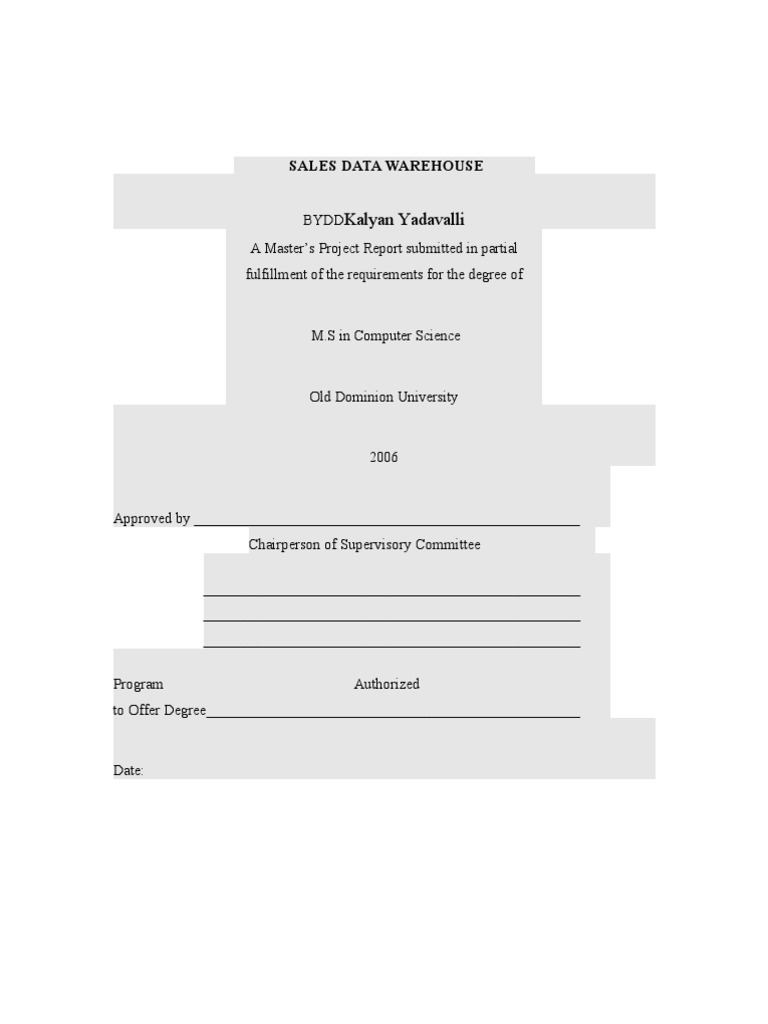 I express my sincere thanks to my project advisor, Dr.Irwin Levinstein, Associate Professor in Computer Science, Old Dominion University, for his encouragement, support and understanding throughout the course of this project work. A special and sincere thanks to the IT department at The Virginian-Pilot, where I am currently employed, for allowing me use SQL Server 2005 suite of products and providing access to marketing database for building the data warehouse. Last but not the least, I express my sincere appreciation and thanks to my family and friends for their invaluable support, patience and encouragement throughout my Masters course.