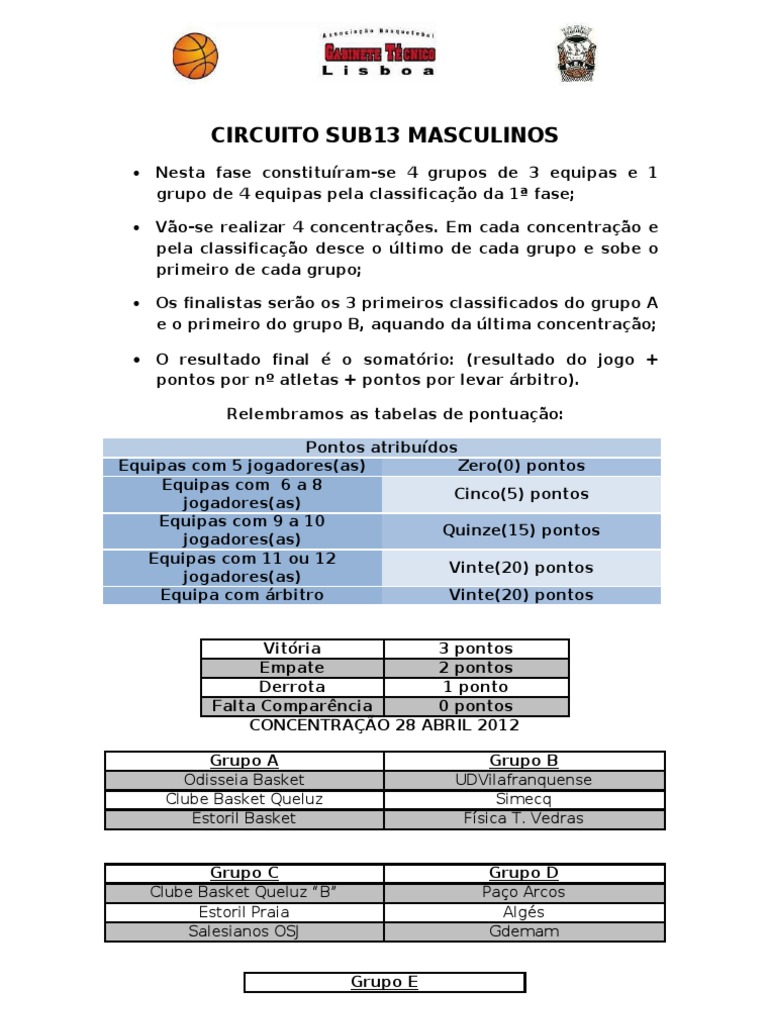 O resultado final o somatrio: (resultado do jogo + pontos por n atletas + pontos por levar rbitro). Relembramos as tabelas de pontuao: Pontos atribudos Equipas com 5 jogadores(as) Zero(0) pontos Equipas com 6 a 8 Cinco(5) pontos jogadores(as) Equipas com 9 a 10 Quinze(15) pontos jogadores(as) Equipas com 11 ou 12 Vinte(20) pontos jogadores(as) Equipa com rbitro Vinte(20) pontos Vitria 3 pontos Empate 2 pontos Derrota 1 ponto Falta Comparncia 0 pontos CONCENTRAO 28 ABRIL 2012 Grupo A Odisseia Basket Clube Basket Queluz Estoril Basket Grupo C Clube Basket Queluz B Estoril Praia Salesianos OSJ Grupo E Grupo B UDVilafranquense Simecq Fsica T. Vedras Grupo D Pao Arcos Algs Gdemam