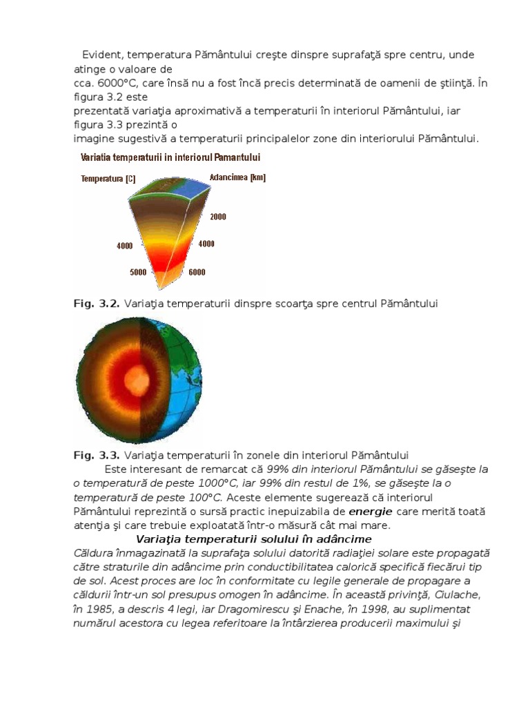 Fig. 3.3. Variaia temperaturii n zonele din interiorul Pmntului Este interesant de remarcat c 99% din interiorul Pmntului se gsete la o temperatur de peste 1000C, iar 99% din restul de 1%, se gsete la o temperatur de peste 100C. Aceste elemente sugereaz c interiorul Pmntului reprezint o surs practic inepuizabila de energie care merit toat atenia i care trebuie exploatat ntr-o msur ct mai mare. Variaia temperaturii solului n adncime Cldura nmagazinat la suprafaa solului datorit radiaiei solare este propagat ctre straturile din adncime prin conductibilitatea caloric specific fiecrui tip de sol. Acest proces are loc n conformitate cu legile generale de propagare a cldurii ntr-un sol presupus omogen n adncime. n aceast privin, Ciulache, n 1985, a descris 4 legi, iar Dragomirescu i Enache, n 1998, au suplimentat numrul acestora cu legea referitoare la ntrzierea producerii maximului i