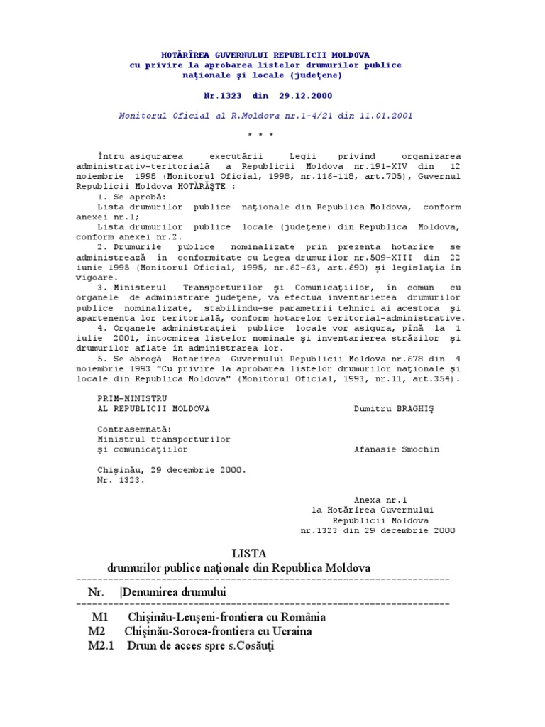 Monitorul Oficial al [Link] nr.1-4/21 din 11.01.2001 * * * ntru asigurarea executrii Legii privind organizarea administrativ-teritorial a Republicii Moldova nr.191-XIV din 12 noiembrie 1998 (Monitorul Oficial, 1998, nr.116-118, art.705), Guvernul Republicii Moldova HOTRTE : 1. Se aprob: Lista drumurilor publice naionale din Republica Moldova, conform anexei nr.1; Lista drumurilor publice locale (judeene) din Republica Moldova, conform anexei nr.2. 2. Drumurile publice nominalizate prin prezenta hotarre se administreaz n conformitate cu Legea drumurilor nr.509-XIII din 22 iunie 1995 (Monitorul Oficial, 1995, nr.62-63, art.690) i legislaia n vigoare. 3. Ministerul Transporturilor i Comunicaiilor, n comun cu organele de administrare judeene, va efectua inventarierea drumurilor publice nominalizate, stabilindu-se parametrii tehnici ai acestora i apartenenta lor teritorial, conform hotarelor teritorial-administrative. 4. Organele administraiei publice locale vor asigura, pn la 1 iulie 2001, ntocmirea listelor nominale i inventarierea strzilor i drumurilor aflate n administrarea lor. 5. Se abrog Hotarrea Guvernului Republicii Moldova nr.678 din 4 noiembrie 1993 "Cu privire la aprobarea listelor drumurilor naionale i locale din Republica Moldova" (Monitorul Oficial, 1993, nr.11, art.354). PRIM-MINISTRU AL REPUBLICII MOLDOVA Contrasemnat: Ministrul transporturilor i comunicaiilor Chiinu, 29 decembrie 2000. Nr. 1323. Anexa nr.1 la Hotrrea Guvernului Republicii Moldova nr.1323 din 29 decembrie 2000 Dumitru BRAGHI