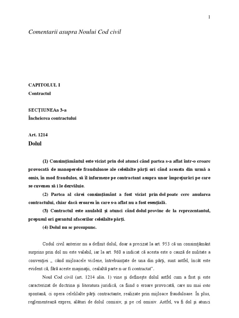 (1) Consimmntul este viciat prin dol atunci cnd partea s-a aflat ntr-o eroare provocat de manoperele frauduloase ale celeilalte pri ori cnd aceasta din urm a omis, n mod fraudulos, s l informeze pe contractant asupra unor mprejurri pe care se cuvenea s i le dezvluie. (2) Partea al crei consimmnt a fost viciat prin dol poate cere anularea contractului, chiar dac eroarea n care s-a aflat nu a fost esenial. (3) Contractul este anulabil i atunci cnd dolul provine de la reprezentantul, prepusul ori gerantul afacerilor celeilalte pri. (4) Dolul nu se presupune. Codul civil anterior nu a definit dolul, doar a precizat la art. 953 c un consimmnt surprins prin dol nu este valabil, iar la art. 960 a indicat c acesta este o cauz de nulitate a conveniei cnd mijloacele viclene, ntrebuinate de una din pri, sunt astfel, nct este evident c, fr aceste mainaii, cealalt parte n-ar fi contractat. Noul Cod civil (art. 1214 alin. 1) vine i definete dolul astfel cum a fost i este caracterizat de doctrina i literatura juridic, ca fiind o eroare provocat, care nu mai este spontan, ci opera celelilalte pri contractante, realizate prin mijloace frauduloase. n plus, reglementeaz expres, alturi de dolul comisiv, i pe cel omisiv. Astfel, va fi dol i atunci
