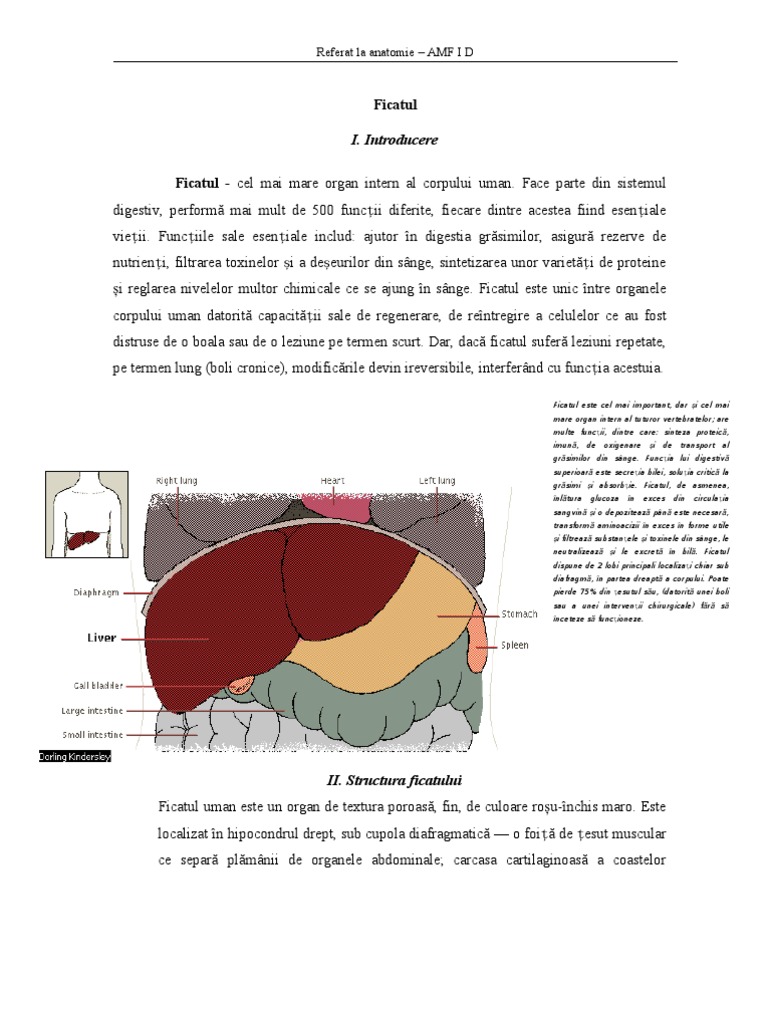 Ficatul I. Introducere Ficatul - cel mai mare organ intern al corpului uman. Face parte din sistemul digestiv, perform mai mult de 500 funcii diferite, fiecare dintre acestea fiind eseniale vieii. Funciile sale eseniale includ: ajutor n digestia grsimilor, asigur rezerve de nutrieni, filtrarea toxinelor i a deeurilor din snge, sintetizarea unor varieti de proteine i reglarea nivelelor multor chimicale ce se ajung n snge. Ficatul este unic ntre organele corpului uman datorit capacitii sale de regenerare, de rentregire a celulelor ce au fost distruse de o boala sau de o leziune pe termen scurt. Dar, dac ficatul sufer leziuni repetate, pe termen lung (boli cronice), modificrile devin ireversibile, interfernd cu funcia acestuia.