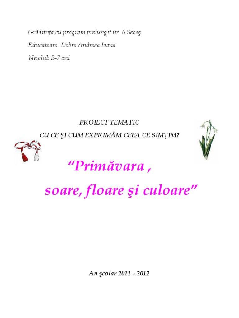 Primavara ne-a btut la geam, am deschis fereastra s intre cldura i veselia ei. mpreun am descoperit mriorul i ghiocelul, iar pe ea am poftit-o la noi n grup, s ne ajute n aflarea rspunsurilor la de ce-urile specifice vrstei precolaritii. Prin decorul amenajat n sal, primvara s-a instalat la noi n grupcnd noi ncercam s gsim subteme pentru proiectul " Primvara floare, soare i culoare". Aceasta este o tem complex deoarece l provoac pe copil s se implice afectiv i efectiv n realizarea sarcinilor, n cutarea i sortarea materialelor necesare, n culegerea de informaii i curioziti referitoare la tema aleas. Proiectul propus atinge obiective nu doar din sfera educaiei estetice, ci i a celei morale i chiar economice, dat fiind faptul c precolarii vor desfura i aciuni de vnzare(mrisoare,lucrri de Pate: felicitri, aranjamente, decoruri ).