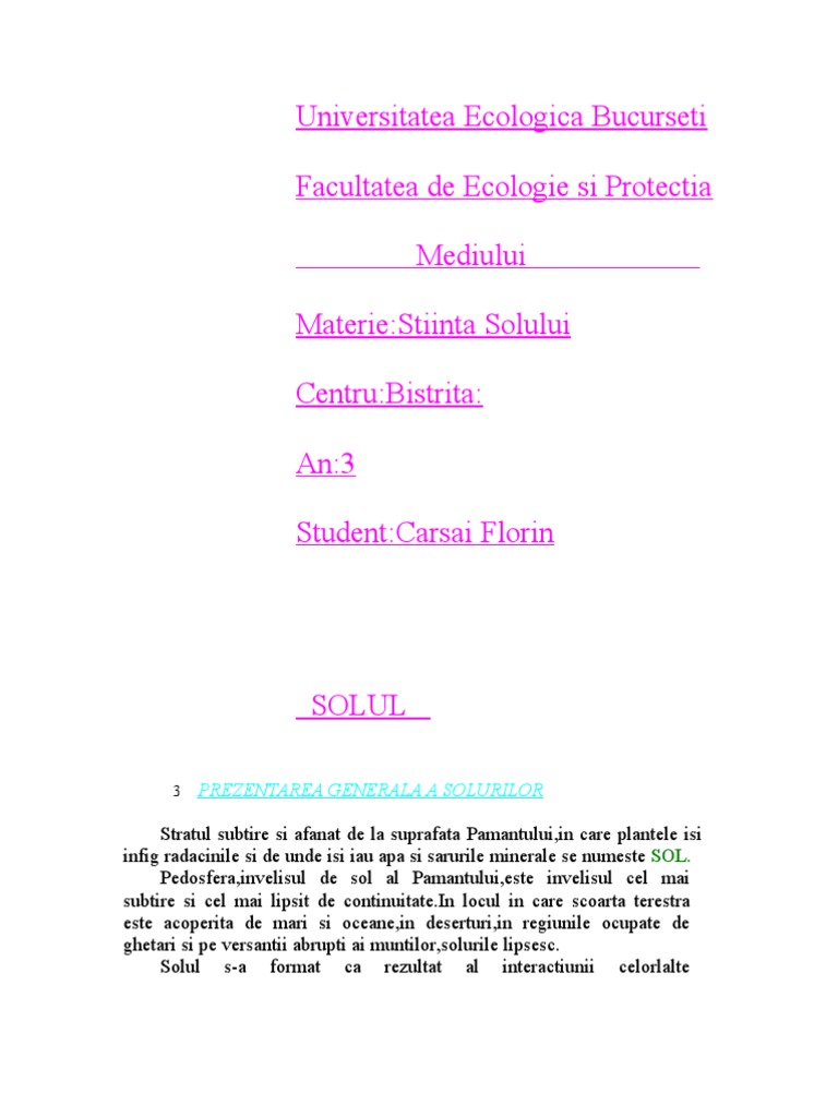 Universitatea Ecologica Bucurseti Facultatea de Ecologie si Protectia Mediului Materie:Stiinta Solului Centru:Bistrita: An:3 Student:Carsai Florin