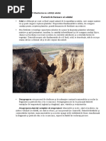 [Link] de formare a solurilor se numeste pedogeneza. Solurile sunt diferite de la un continent la altul,de la o regiune la alta,dar si in cadrul aceleiasi [Link] care influenteaza formarea si dezvoltarea solului sunt:roca,clima,vegetatia,timpul si formele de [Link] poarta numele de factori pedogenetici. [Link] se formeaza din rocile faramitate (dezagregate).Tipul de roca determina grosimea solului,culoarea si substantele minerale pe care le contine [Link] din care provine solul se numeste roca mama. Pe roci sedimentare,care se maruntesc usor,se formeaza soluri cu grosimi mari,in timp ce, pe rocile dure,solurile au grosimi [Link] functie de roca,solurile sunt nisipoase,argiloase,pietroase sau lutoase. [Link] aerului contribuie la dezagregarea [Link] acelasi timp,clima influenteaza activitatea microorganismelor care descompun plantele si animalele moarte,imbogatind astfel solul in substante hranitoare necesare plantelor. In regiunile foarte calde si umede are loc descompunerea si consumarea rapida a resturilor vegetale de catre bacterii,in timp ce in cele reci procesul este foarte lent. PRECIPITATIILE. Apa ajuta la dezagregarea rocilor din care se formeaza solul si dizolva substantele minerale si organice din sol,formandu-se astfel solutia de sol cu care se hranesc plantele. Precipitatiile prea bogate spala solul de aceste substante,saracindul,iar lipsa lor impiedica dizolvarea sarurilor minerale. VEGETATIA este foarte importanta pentru calitatea solului,deoarece contribuie la imbogatirea acestuia cu materie organica (humus) si la dobandirea principalei insusiri a solului-fertilitatea sau rodnicia sa.