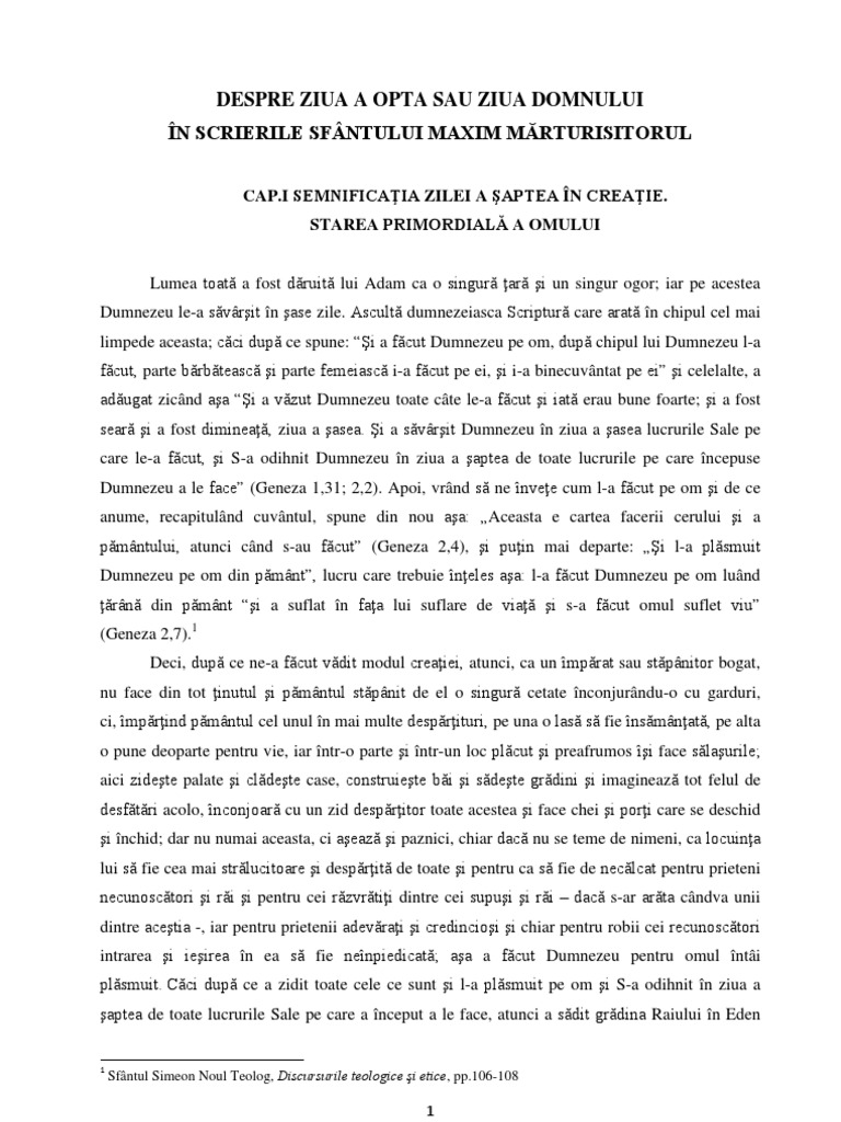 [Link] ZIUA A OPTA N TEOLOGIA SFNTULUI MAXIM MRTURISITORUL n Simbolul Credinei rostim: Atept nvierea morilor i viaa veacului ce va s fie, nelegnd prin aceasta c lumea i va pierde chipul actual i, la timpul hotrt de Dumnezeu, se va transforma. Ciclul existenial al lumii nu va culmina cu o distrugere a acesteia sau cu o afundare n nefiina din care a provenit, ci telosul creaiei este de a se arta la sfritul veacurilor n alt form, cand Trupul nviat al lui Hristos va cpta dimensiuni universale, cosmice, iar ntreaga lume se va releva ca un trup tainic al lui Dumnezeu, ca Dumnezeu s fie totul in toate. (I Corinteni 15,28)11 n teologia Sfinilor Prini, venicia creaiei transfigurate alturi de Hristos Domnul este redata prin expresia ziua a opta a creaiei. n opozitie cu saptmna de apte zile, care masoar timpul finit, ziua a opta nchipuiete felul strii mai presus de fire si de vreme12, definete un nou nceput i o alt stare care nu va mai fi supus schimbrii, pentru c ziua a opta nu se va fri niciodat i nici nu va fi msurat cu perioade trectoare ale timpului, ci va fi un timp format nu din succesiuni de momente trectoare, pieritoare, ci din relaia de dragoste plenar, care se svrete nencetat ntr-o transfigurare dinamic din slav in slav. (II Corinteni 3,18)13 Ziua a opta este caracterizat de desfiinarea distanei fizice dintre Dumnezeu i om, nseamna unirea lui Dumnezeu cu Adam cel universal, fr s ating sau s foreze libertatea fiecrei persoane. Dup cuvintele Sfntului Maxim Mrturisitorul, pentru cei vrednici, unirea va fi desftare dumnezeiasc i mai presus de orice nelegere, n timp ce pentru cei nevrednici, pentru cei care refuz iubirea jertfelnic a lui Dumnezeu, aceast unire se va transforma ntr-o suferin de negrit.14 Iubirea lui Dumnezeu, specific zilei a opta, este intotdeauna cea care judec dup dreptate, cea care d fiecruia dup dreptate: i vor iei cei ce au fcut cele bune spre nvierea vieii i cei ce au fcut cele rele spre nvierea osndirii. (Ioan 5,29) Alt calitate de via nu exist n ziua a opta: iubirea este cea care judec, iubirea este cea care d fiecruia dup dreptate, i dup iubirea lui fa de semenii si i fa de Dumnezeu.15 Aceasta este porunca Mea; s v iubiti unul pe altul, precum v-am iubit Eu (Ioan 15, 12). Cel ce nu iubete n-a cunoscut pe Dumnezeu, pentru c Dumnezeu este iubire (I Ioan 4, 8).