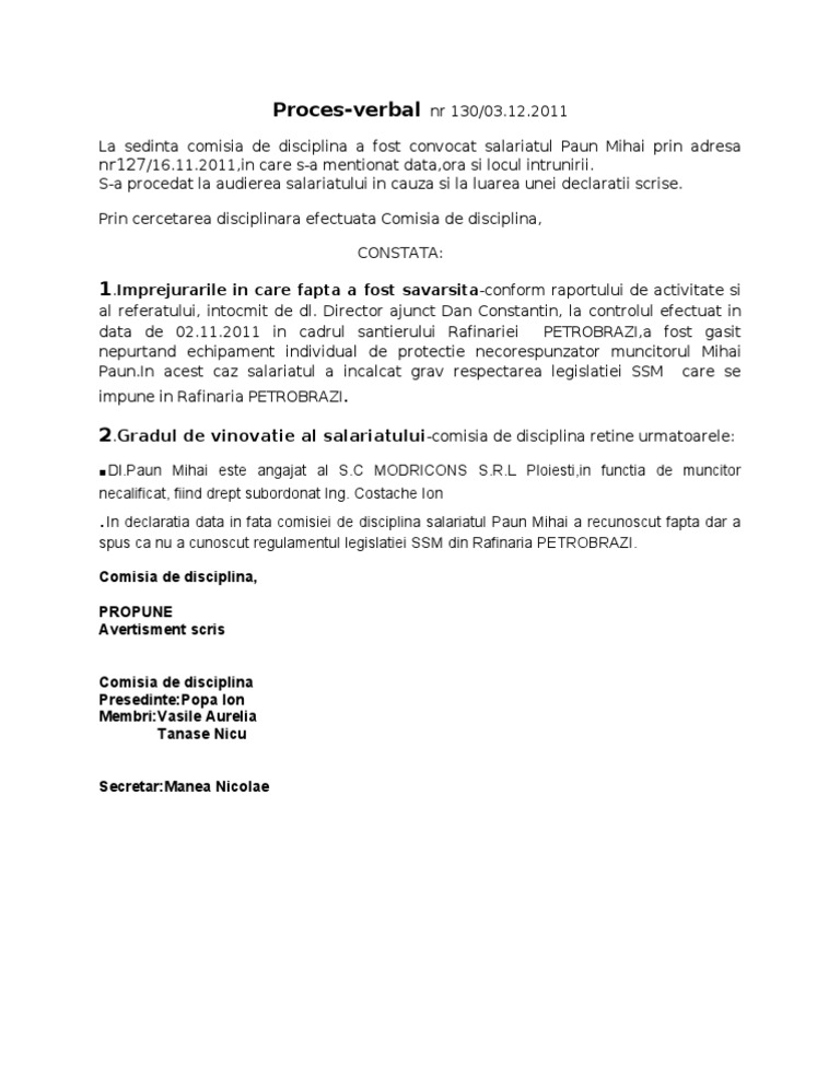 spus ca nu a cunoscut regulamentul legislatiei SSM din Rafinaria PETROBRAZI. Comisia de disciplina, PROPUNE Avertisment scris Comisia de disciplina Presedinte:Popa Ion Membri:Vasile Aurelia Tanase Nicu Secretar:Manea Nicolae