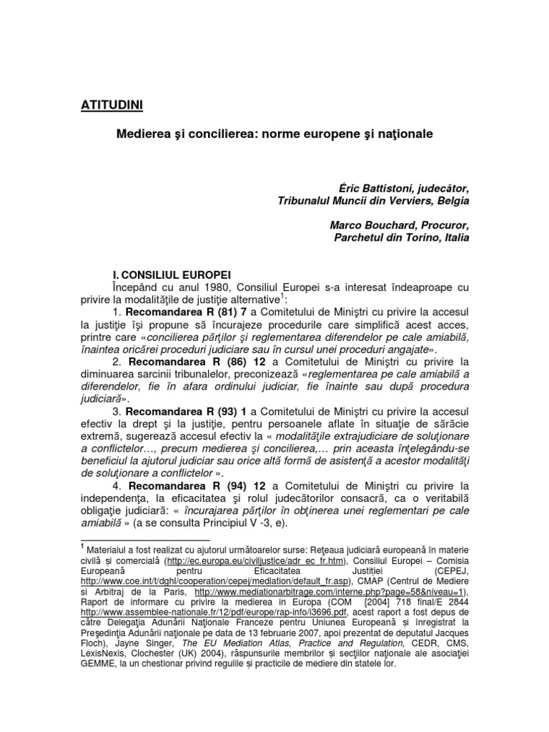 I. CONSILIUL EUROPEI ncepnd cu anul 1980, Consiliul Europei s-a interesat ndeaproape cu privire la modalitile de justiie alternative1: 1. Recomandarea R (81) 7 a Comitetului de Minitri cu privire la accesul la justiie i propune s ncurajeze procedurile care simplific acest acces, printre care concilierea prilor i reglementarea diferendelor pe cale amiabil, naintea oricrei proceduri judiciare sau n cursul unei proceduri angajate. 2. Recomandarea R (86) 12 a Comitetului de Minitri cu privire la diminuarea sarcinii tribunalelor, preconizeaz reglementarea pe cale amiabil a diferendelor, fie n afara ordinului judiciar, fie nainte sau dup procedura judiciar. 3. Recomandarea R (93) 1 a Comitetului de Minitri cu privire la accesul efectiv la drept i la justiie, pentru persoanele aflate n situaie de srcie extrem, sugereaz accesul efectiv la modalitile extrajudiciare de soluionare a conflictelor, precum medierea i concilierea, prin aceasta nelegndu-se beneficiul la ajutorul judiciar sau orice alt form de asisten a acestor modaliti de soluionare a conflictelor . 4. Recomandarea R (94) 12 a Comitetului de Minitri cu privire la independena, la eficacitatea i rolul judectorilor consacr, ca o veritabil obligaie judiciar: ncurajarea prilor n obinerea unei reglementari pe cale amiabil (a se consulta Principiul V -3, e).