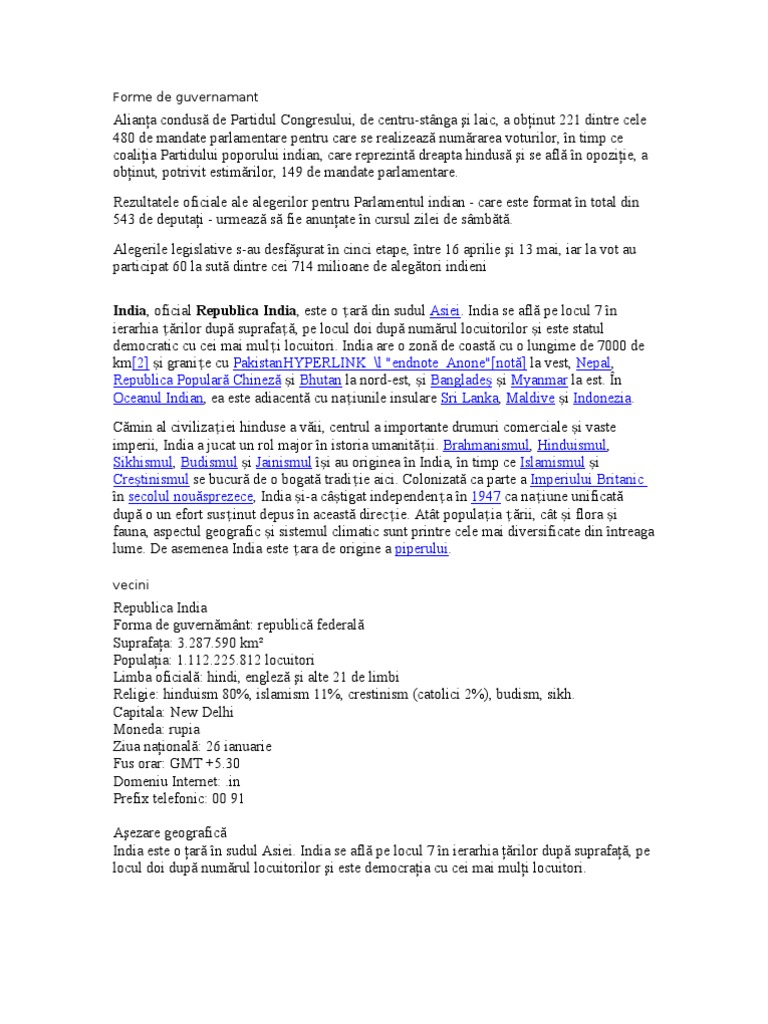Aliana condus de Partidul Congresului, de centru-stnga i laic, a obinut 221 dintre cele 480 de mandate parlamentare pentru care se realizeaz numrarea voturilor, n timp ce coaliia Partidului poporului indian, care reprezint dreapta hindus i se afl n opoziie, a obinut, potrivit estimrilor, 149 de mandate parlamentare. Rezultatele oficiale ale alegerilor pentru Parlamentul indian - care este format n total din 543 de deputai - urmeaz s fie anunate n cursul zilei de smbt. Alegerile legislative s-au desfurat n cinci etape, ntre 16 aprilie i 13 mai, iar la vot au participat 60 la sut dintre cei 714 milioane de alegtori indieni India, oficial Republica India, este o ar din sudul Asiei. India se afl pe locul 7 n ierarhia rilor dup suprafa, pe locul doi dup numrul locuitorilor i este statul democratic cu cei mai muli locuitori. India are o zon de coast cu o lungime de 7000 de km[2] i granie cu PakistanHYPERLINK \l "endnote_Anone"[not] la vest, Nepal, Republica Popular Chinez i Bhutan la nord-est, i Banglade i Myanmar la est. n Oceanul Indian, ea este adiacent cu naiunile insulare Sri Lanka, Maldive i Indonezia. Cmin al civilizaiei hinduse a vii, centrul a importante drumuri comerciale i vaste imperii, India a jucat un rol major n istoria umanitii. Brahmanismul, Hinduismul, Sikhismul, Budismul i Jainismul i au originea n India, n timp ce Islamismul i Cretinismul se bucur de o bogat tradiie aici. Colonizat ca parte a Imperiului Britanic n secolul nousprezece, India i-a ctigat independena n 1947 ca naiune unificat dup o un efort susinut depus n aceast direcie. Att populaia rii, ct i flora i fauna, aspectul geografic i sistemul climatic sunt printre cele mai diversificate din ntreaga lume. De asemenea India este ara de origine a piperului.