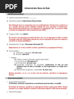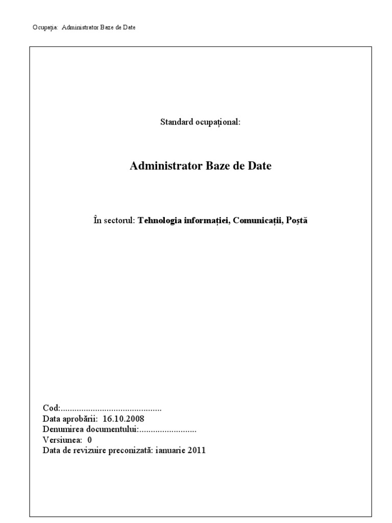 Denumire AO: Analiza Ocupaional - Administrator Baze de Date Data elaborrii: iulie 2008 Responsabilitatea pentru coninutul acestui standard ocupaional i al calificrilor bazate pe acest standard ocupaional revine Comitetului Sectorial pentru Tehnologia Informaiei, Comunicaii i Pot. Data validrii: 3 octombrie 2008 Comisia de validare: Preedinte: Gheorghe erban Membrii: Remus Tudoric Carmen Dimofte
