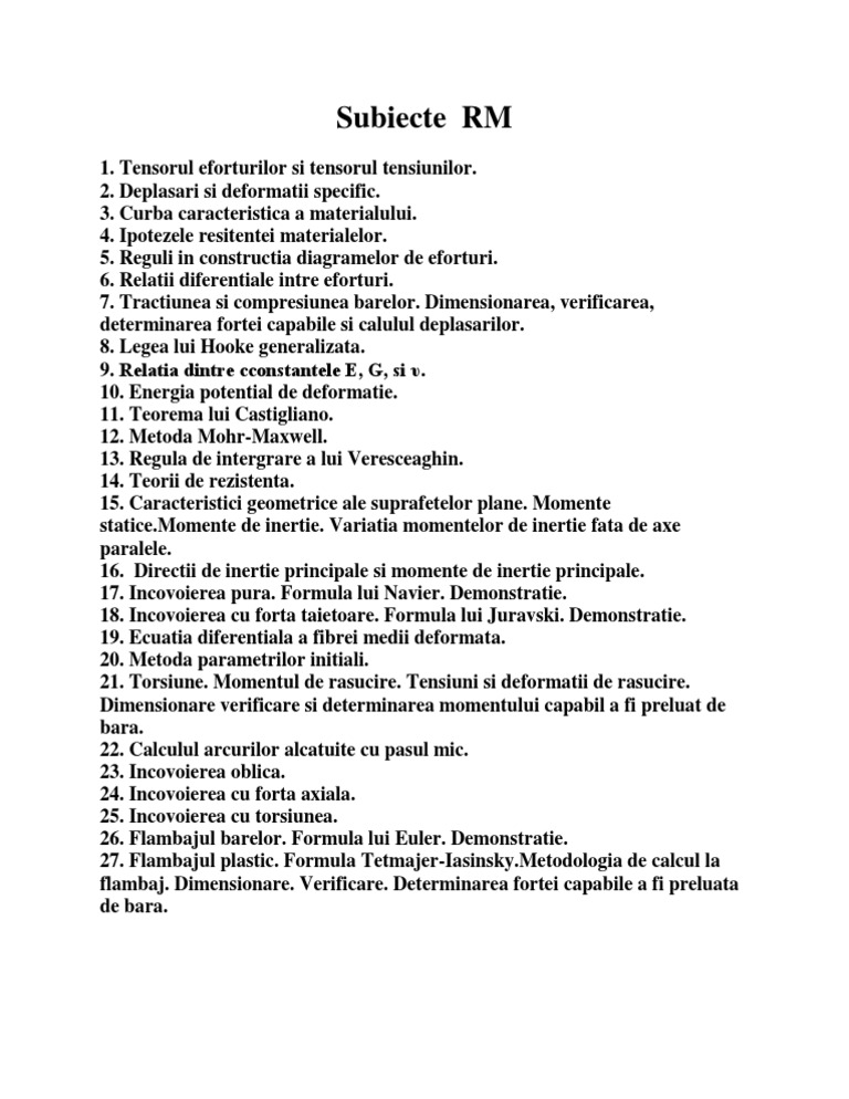 1. Tensorul eforturilor si tensorul tensiunilor. 2. Deplasari si deformatii specific. 3. Curba caracteristica a materialului. 4. Ipotezele resitentei materialelor. 5. Reguli in constructia diagramelor de eforturi. 6. Relatii diferentiale intre eforturi. 7. Tractiunea si compresiunea barelor. Dimensionarea, verificarea, determinarea fortei capabile si calulul deplasarilor. 8. Legea lui Hooke generalizata. 9. Relatia dintre cconstantele E, G, si . 10. Energia potential de deformatie. 11. Teorema lui Castigliano. 12. Metoda Mohr-Maxwell. 13. Regula de intergrare a lui Veresceaghin. 14. Teorii de rezistenta. 15. Caracteristici geometrice ale suprafetelor plane. Momente [Link] de inertie. Variatia momentelor de inertie fata de axe paralele. 16. Directii de inertie principale si momente de inertie principale. 17. Incovoierea pura. Formula lui Navier. Demonstratie. 18. Incovoierea cu forta taietoare. Formula lui Juravski. Demonstratie. 19. Ecuatia diferentiala a fibrei medii deformata. 20. Metoda parametrilor initiali. 21. Torsiune. Momentul de rasucire. Tensiuni si deformatii de rasucire. Dimensionare verificare si determinarea momentului capabil a fi preluat de bara. 22. Calculul arcurilor alcatuite cu pasul mic. 23. Incovoierea oblica. 24. Incovoierea cu forta axiala. 25. Incovoierea cu torsiunea. 26. Flambajul barelor. Formula lui Euler. Demonstratie. 27. Flambajul plastic. Formula [Link] de calcul la flambaj. Dimensionare. Verificare. Determinarea fortei capabile a fi preluata de bara.