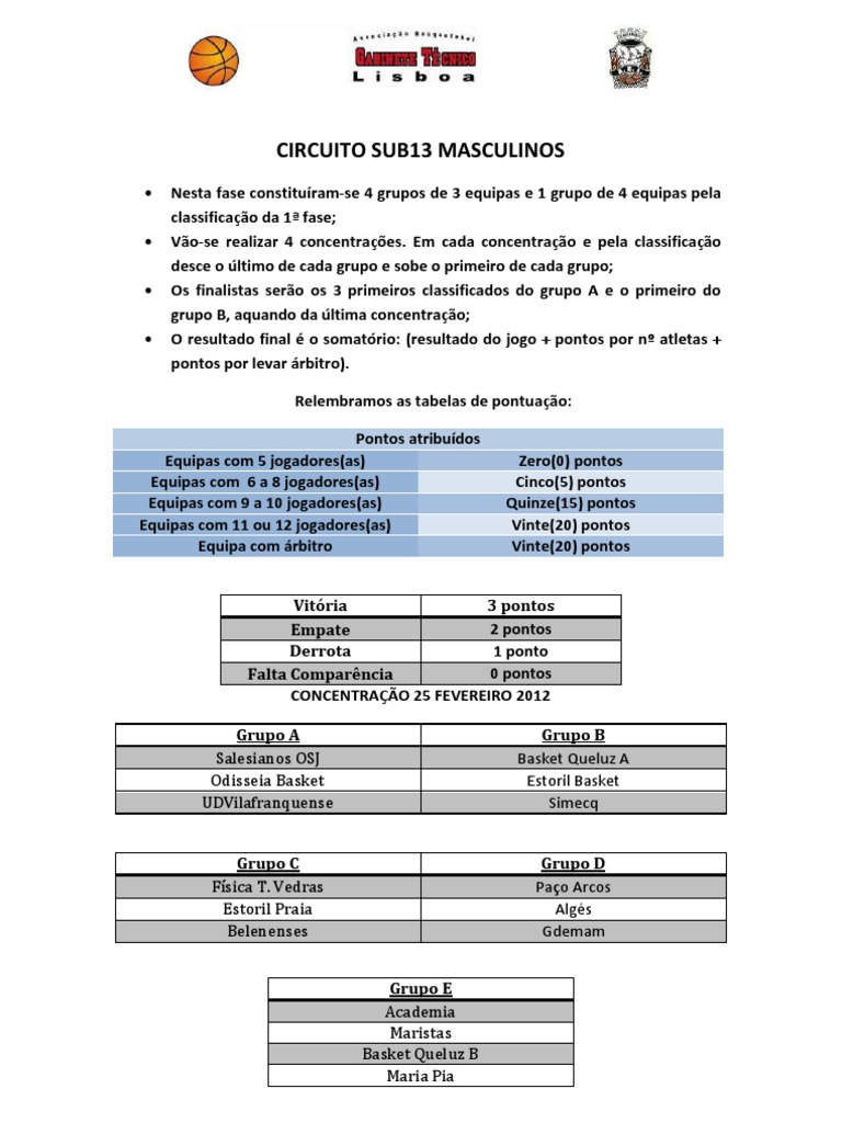 Vitria 3 pontos 2 pontos Empate 1 ponto Derrota 0 pontos Falta Comparncia CONCENTRAO 25 FEVEREIRO 2012 Grupo A Salesianos OSJ Odisseia Basket UDVilafranquense Grupo C Fsica T. Vedras Estoril Praia Belenenses Grupo E Academia Maristas Basket Queluz B Maria Pia Grupo B Basket Queluz A Estoril Basket Simecq Grupo D Pao Arcos Algs Gdemam