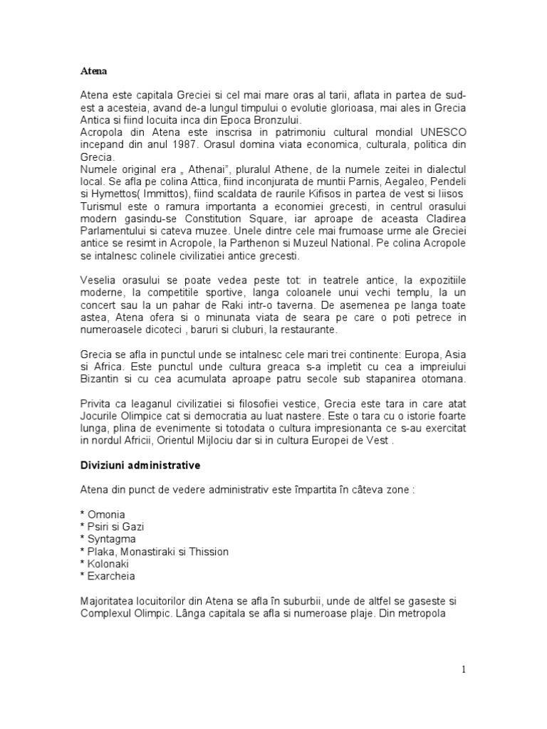 de-a lungul timpului o evolutie glorioasa, mai ales in Grecia Antica si fiind locuita inca din Epoca Bronzului. Acropola din Atena este inscrisa in patrimoniu cultural mondial UNESCO incepand din anul 1987. Orasul domina viata economica, culturala, politica din Grecia. Numele original era Athenai, pluralul Athene, de la numele zeitei in dialectul local. Se afla pe colina Attica, fiind inconjurata de muntii Parnis, Aegaleo, Pendeli si Hymettos( Immittos), fiind scaldata de raurile Kifisos in partea de vest si Iiisos Turismul este o ramura importanta a economiei grecesti, in centrul orasului modern gasindu-se Constitution Square, iar aproape de aceasta Cladirea Parlamentului si cateva muzee. Unele dintre cele mai frumoase urme ale Greciei antice se resimt in Acropole, la Parthenon si Muzeul National. Pe colina Acropole se intalnesc colinele civilizatiei antice grecesti. Veselia orasului se poate vedea peste tot: in teatrele antice, la expozitiile moderne, la competitile sportive, langa coloanele unui vechi templu, la un concert sau la un pahar de Raki intr-o taverna. De asemenea pe langa toate astea, Atena ofera si o minunata viata de seara pe care o poti petrece in numeroasele dicoteci , baruri si cluburi, la restaurante. Grecia se afla in punctul unde se intalnesc cele mari trei continente: Europa, Asia si Africa. Este punctul unde cultura greaca s-a impletit cu cea a impreiului Bizantin si cu cea acumulata aproape patru secole sub stapanirea otomana. Privita ca leaganul civilizatiei si filosofiei vestice, Grecia este tara in care atat Jocurile Olimpice cat si democratia au luat nastere. Este o tara cu o istorie foarte lunga, plina de evenimente si totodata o cultura impresionanta ce s-au exercitat in nordul Africii, Orientul Mijlociu dar si in cultura Europei de Vest . Diviziuni administrative Atena din punct de vedere administrativ este mpartita n cteva zone : * Omonia * Psiri si Gazi * Syntagma * Plaka, Monastiraki si Thission * Kolonaki * Exarcheia Majoritatea locuitorilor din Atena se afla n suburbii, unde de altfel se gaseste si Complexul Olimpic. Lnga capitala se afla si numeroase plaje. Din metropola