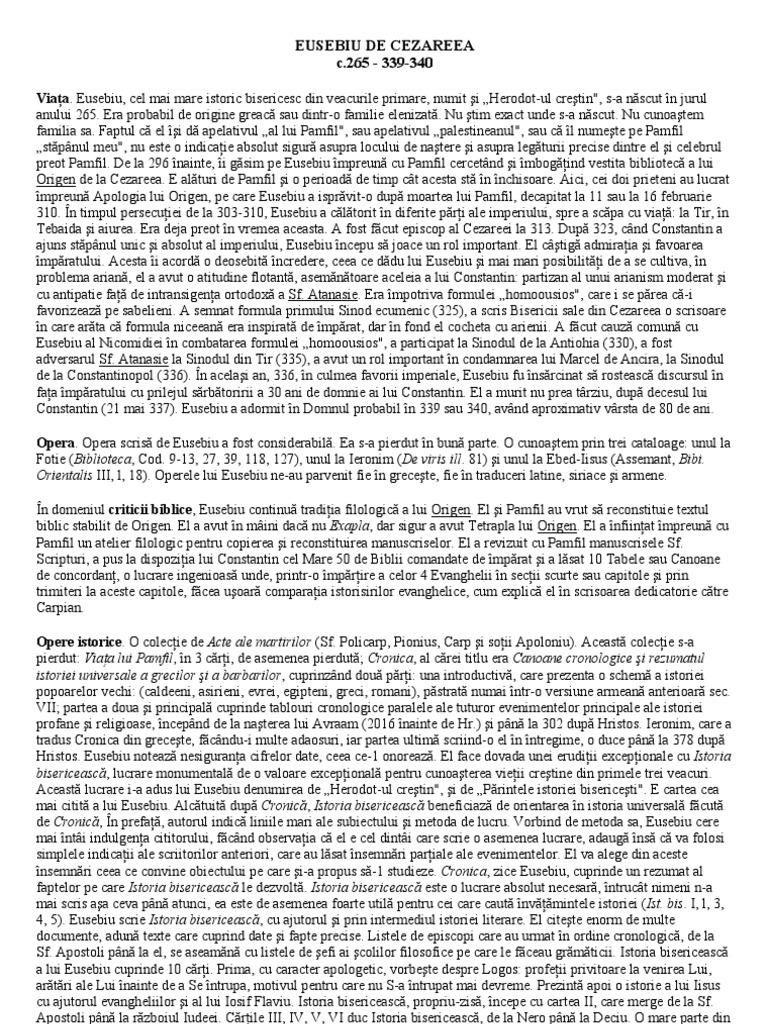 Viaa. Eusebiu, cel mai mare istoric bisericesc din veacurile primare, numit i Herodot-ul cretin", s-a nscut n jurul anului 265. Era probabil de origine greac sau dintr-o familie elenizat. Nu tim exact unde s-a nscut. Nu cunoatem familia sa. Faptul c el i d apelativul al lui Pamfil", sau apelativul palestineanul", sau c l numete pe Pamfil stpnul meu", nu este o indicaie absolut sigur asupra locului de natere i asupra legturii precise dintre el i celebrul preot Pamfil. De la 296 nainte, i gsim pe Eusebiu mpreun cu Pamfil cercetnd i mbogind vestita bibliotec a lui Origen de la Cezareea. E alturi de Pamfil i o perioad de timp ct acesta st n nchisoare. Aici, cei doi prieteni au lucrat mpreun Apologia lui Origen, pe care Eusebiu a isprvit-o dup moartea lui Pamfil, decapitat la 11 sau la 16 februarie 310. n timpul persecuiei de la 303-310, Eusebiu a cltorit n diferite pri ale imperiului, spre a scpa cu via: la Tir, n Tebaida i aiurea. Era deja preot n vremea aceasta. A fost fcut episcop al Cezareei la 313. Dup 323, cnd Constantin a ajuns stpnul unic i absolut al imperiului, Eusebiu ncepu s joace un rol important. El ctig admiraia i favoarea mpratului. Acesta i acord o deosebit ncredere, ceea ce ddu lui Eusebiu i mai mari posibiliti de a se cultiva, n problema arian, el a avut o atitudine flotant, asemntoare aceleia a lui Constantin: partizan al unui arianism moderat i cu antipatie fa de intransigena ortodox a Sf. Atanasie. Era mpotriva formulei homoousios", care i se prea c-i favorizeaz pe sabelieni. A semnat formula primului Sinod ecumenic (325), a scris Bisericii sale din Cezareea o scrisoare n care arta c formula niceean era inspirat de mprat, dar n fond el cocheta cu arienii. A fcut cauz comun cu Eusebiu al Nicomidiei n combatarea formulei homoousios", a participat la Sinodul de la Antiohia (330), a fost adversarul Sf. Atanasie la Sinodul din Tir (335), a avut un rol important n condamnarea lui Marcel de Ancira, la Sinodul de la Constantinopol (336). n acelai an, 336, n culmea favorii imperiale, Eusebiu fu nsrcinat s rosteasc discursul n faa mpratului cu prilejul srbtoririi a 30 ani de domnie ai lui Constantin. El a murit nu prea trziu, dup decesul lui Constantin (21 mai 337). Eusebiu a adormit n Domnul probabil n 339 sau 340, avnd aproximativ vrsta de 80 de ani. Opera. Opera scris de Eusebiu a fost considerabil. Ea s-a pierdut n bun parte. O cunoatem prin trei cataloage: unul la Fotie (Biblioteca, Cod. 9-13, 27, 39, 118, 127), unul la Ieronim (De viris ill. 81) i unul la Ebed-Iisus (Assemant, Bibi. Orientalis III, l, 18). Operele lui Eusebiu ne-au parvenit fie n grecete, fie n traduceri latine, siriace i armene. n domeniul criticii biblice, Eusebiu continu tradiia filologic a lui Origen. El i Pamfil au vrut s reconstituie textul biblic stabilit de Origen. El a avut n mini dac nu Exapla, dar sigur a avut Tetrapla lui Origen. El a nfiinat mpreun cu Pamfil un atelier filologic pentru copierea i reconstituirea manuscriselor. El a revizuit cu Pamfil manuscrisele Sf. Scripturi, a pus la dispoziia lui Constantin cel Mare 50 de Biblii comandate de mprat i a lsat 10 Tabele sau Canoane de concordan, o lucrare ingenioas unde, printr-o mprire a celor 4 Evanghelii n secii scurte sau capitole i prin trimiteri la aceste capitole, fcea uoar comparaia istorisirilor evanghelice, cum explic el n scrisoarea dedicatorie ctre Carpian. Opere istorice. O colecie de Acte ale martirilor (Sf. Policarp, Pionius, Carp i soii Apoloniu). Aceast colecie s-a pierdut: Viaa lui Pamfil, n 3 cri, de asemenea pierdut; Cronica, al crei titlu era Canoane cronologice i rezumatul istoriei universale a grecilor i a barbarilor, cuprinznd dou pri: una introductiv, care prezenta o schem a istoriei popoarelor vechi: (caldeeni, asirieni, evrei, egipteni, greci, romani), pstrat numai ntr-o versiune armean anterioar sec. VII; partea a doua i principal cuprinde tablouri cronologice paralele ale tuturor evenimentelor principale ale istoriei profane i religioase, ncepnd de la naterea lui Avraam (2016 nainte de Hr.) i pn la 302 dup Hristos. Ieronim, care a tradus Cronica din grecete, fcndu-i multe adaosuri, iar partea ultim scriind-o el n ntregime, o duce pn la 378 dup Hristos. Eusebiu noteaz nesigurana cifrelor date, ceea ce-1 onoreaz. El face dovada unei erudiii excepionale cu Istoria bisericeasc, lucrare monumental de o valoare excepional pentru cunoaterea vieii cretine din primele trei veacuri. Aceast lucrare i-a adus lui Eusebiu denumirea de Herodot-ul cretin", i de Printele istoriei bisericeti". E cartea cea mai citit a lui Eusebiu. Alctuit dup Cronic, Istoria bisericeasc beneficiaz de orientarea n istoria universal fcut de Cronic, n prefa, autorul indic liniile mari ale subiectului i metoda de lucru. Vorbind de metoda sa, Eusebiu cere mai nti indulgena cititorului, fcnd observaia c el e cel dinti care scrie o asemenea lucrare, adaug ns c va folosi simplele indicaii ale scriitorilor anteriori, care au lsat nsemnri pariale ale evenimentelor. El va alege din aceste nsemnri ceea ce convine obiectului pe care i-a propus s-1 studieze. Cronica, zice Eusebiu, cuprinde un rezumat al faptelor pe care Istoria bisericeasc le dezvolt. Istoria bisericeasc este o lucrare absolut necesar, ntruct nimeni n-a mai scris aa ceva pn atunci, ea este de asemenea foarte util pentru cei care caut nvmintele istoriei (Ist. bis. I, l, 3, 4, 5). Eusebiu scrie Istoria bisericeasc, cu ajutorul i prin intermediul istoriei literare. El citete enorm de multe documente, adun texte care cuprind date i fapte precise. Listele de episcopi care au urmat n ordine cronologic, de la Sf. Apostoli pn la el, se aseamn cu listele de efi ai colilor filosofice pe care le fceau grmticii. Istoria bisericeasc a lui Eusebiu cuprinde 10 cri. Prima, cu caracter apologetic, vorbete despre Logos: profeii privitoare la venirea Lui, artri ale Lui nainte de a Se ntrupa, motivul pentru care nu S-a ntrupat mai devreme. Prezint apoi o istorie a lui Iisus cu ajutorul evangheliilor i al lui Iosif Fla