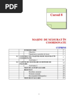 variaz, iar distana pe care a fost efectuat deplasarea se determin prin contorizarea tranziiilor nchis/deschis. Lungimea unei lini din scala variaz de la civa microni pn la sute de microni. Semnalul de ieire al riglei de sticl este interpolat, astfel nct poate fi atins o rezoluie mai mare dect grila n sine. Rezoluia care se poate atinge este de 0,1m. Direcia de micare poate fi nregistrat prin folosirea unui al doilea receptor i o a dou gril rotit la 90 Materialul din care sunt confectionate riglele este la la mainile moderne Zerodur (material ceramic sticlos) care are un coeficient de dilatare foarte redus (10-6 la un interval ntre 0 i 50). Comportarea termic a codificatoarelor liniare este un criteriu esenial pentru acurateea mainii. Ca o regul general, comportamentul termic al unui codificator liniar trebuie s fie acelai cu al obiectului sau piesei msurate. n timpul schimbrilor de temperatur, aceste codificatoare trebuie s se dilate i contracte n acelai mod de fiecare dat. Potrivit legii lui Abbe, sistemele de msur trebuie s fie aliniate cu elementul ce trebuie msurat. Acest lucru poate fi atins doar la mainile care fac msurri speciale, ex: pentru detectarea lungimii unui bloc de cale n funcie de arhitectura mainii. 2.3.5 Capetele de masurare Capetele de msur sunt constituite dintr-un palpator i, n anumite cazuri, extensii ale acestuia i sisteme de schimbare, stilusuri, stilete i extensii ale stilusurilor.[ISO 10360-1:2000]. La o main de msurat n coordonate, capul de msur declaneaz determinarea punctului msurat. n momentul declanrii, toate riglele de msur de pe axe sunt citite. Capul de msur d coordonatele punctului atins al obiectului msurat in sistemul de coordonate al mainii. Acest lucru este fcut tactil printr-un palpator conectat rigid sau fara contact prin capul de msur cu ntreg ansamblul mobil. Repetabilitatea i consistena sunt condiii asigurate de fiecare punct atins. 1. Pinola (componenta unei MMC care poart capul de citire) 2. Extensia palpatorului 3. Sistem de schimbare a palpatorului 4. Senzor: dispozitiv care genereaz semnalele de-a lungul scanrii 5. Sistem de schimbare a stilusului 6. Extensia plapatorului 7. Tija palpatorului Fig.2.7 Capete de masurare 8. Palpator: dispozitiv mecanic format dintr-un vrf i tij 9. Vrful palpatorului: element fizic ce face contactul cu piesa. Acest vrf poate fi o bil, cilindru, disc etc. 10. Diametrul vrfului 11. Cap de msurare 12. Sistemul palpatoarelor: Pot fi distinse mai multe tipuri de capete de masurare: