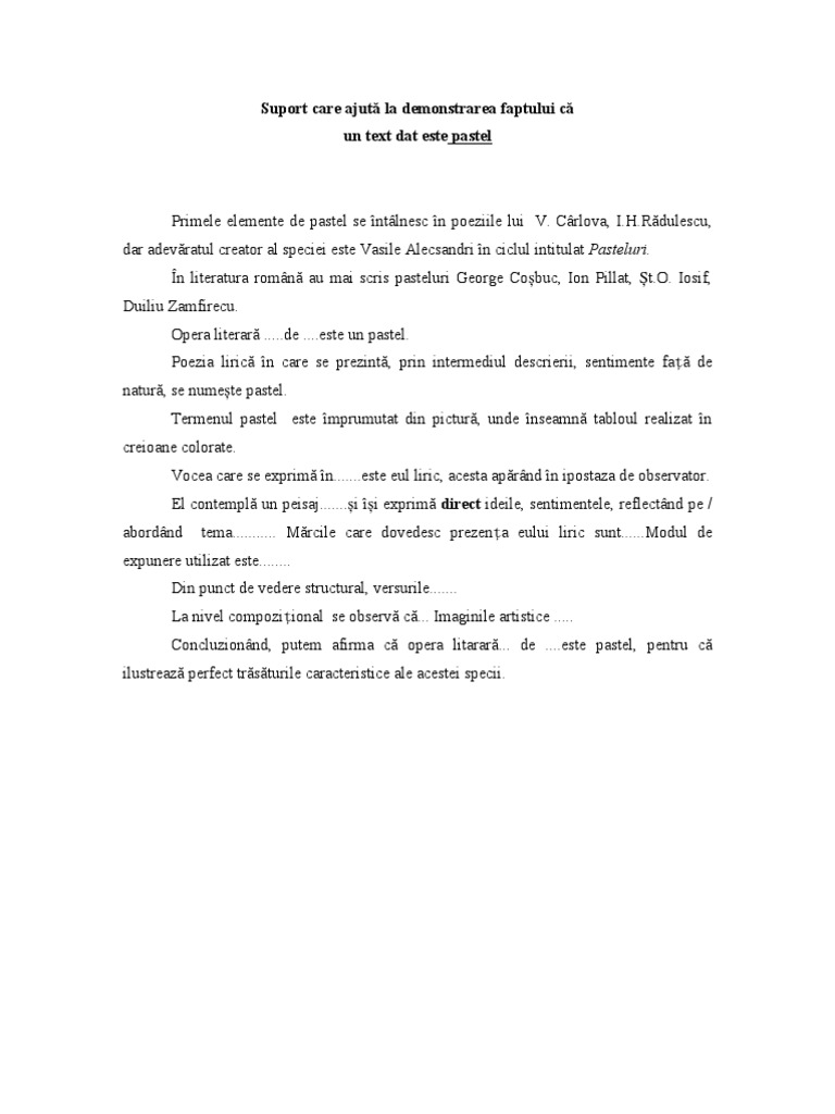 Primele elemente de pastel se ntlnesc n poeziile lui V. Crlova, [Link], dar adevratul creator al speciei este Vasile Alecsandri n ciclul intitulat Pasteluri. n literatura romn au mai scris pasteluri George Cobuc, Ion Pillat, t.O. Iosif, Duiliu Zamfirecu. Opera literar .....de ....este un pastel. Poezia liric n care se prezint, prin intermediul descrierii, sentimente fa de natur, se numete pastel. Termenul pastel este mprumutat din pictur, unde nseamn tabloul realizat n creioane colorate. Vocea care se exprim n.......este eul liric, acesta aprnd n ipostaza de observator. El contempl un peisaj.......i i exprim direct ideile, sentimentele, reflectnd pe / abordnd tema........... Mrcile care dovedesc prezena eului liric sunt......Modul de expunere utilizat este........ Din punct de vedere structural, versurile....... La nivel compoziional se observ c... Imaginile artistice ..... Concluzionnd, putem afirma c opera litarar... de ....este pastel, pentru c ilustreaz perfect trsturile caracteristice ale acestei specii.