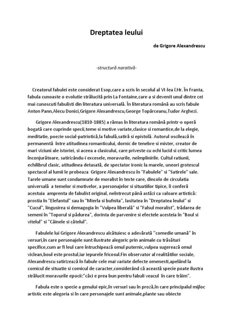 indecis, fcnd multe victime: "Acum snge mult curse, si multe luni trecur,/ Fr-a se putea sti/ Cine va birui./ Elefantul nsos,/ Si bivolul pieptos,/ Cu lupul coadlung,/ Multe izbnzi fcur." Rzboiul devine, ca totdeauna, un prilej pentru consumarea energiilor combatantilor si pentru anihilarea fizic a participantilor: "Ici se vedea un taur jumtate mncat;/ Lng el un tovars ce zbiar si l plnge;/ Colo, un porc slbatec fr dou picioare;/ Si mai la vale, vulpea se tvleste, moare,/ Oftnd dup curcanii ce nc i-au scpat." Pentru a pune capt confruntrii cu final incert, evident prin victorie, leul se adreseaz unui proroc, maimuta care era "vestit vrjitoare".Ironia poetului cu privire la impostura maimutei este acid,deoarece aceasta putea proroci numai faptele care se petrecuser deja: ntmplrile toate, dup ce se [Link],dorind s-si bat joc de infatuarea si ifosele leului,l-a sftuit s sacrifice pe cel mai puternic animal de pe cuprinsul mprtiei,adic pe el [Link] leului este tipic pentru conductorul tiran si las,deoarece dac pn atunci ar fi distrus pe oricine ndrznea s se cread mai puternic dect el,de data asta se plnge cu ipocrizie cci ptimesc de tuse. Vulpea rezum n aceeasi tonalitate satiric viclenia primar a leului: "Ceare a face! rspunse,/ nltimea ta esti/ Orict de slab poftesti.". Poetul creeaz aici un comic de situatie ntlnit n societatea real si anume c cel mai puternic poate fi,dup interes si mprejurri,cel mai slab,dac asa doreste el s par ntr-o anumit [Link] supusii mpratului i dau dreptate cu umilint si chiar lighioanele ce erau mai coltate si inventeaz slbiciuni si betesuguri :Dar si puterea noastr/E ndestul de proast. ntlnim n fabula aceasta o ipostaz nou a [Link] maimuta e un personaj secundar a crui portretizare ironic denot luminismul lui Gr. Alexandrescu,adversar al superstitiilor,[Link] tinteste probabil s ridiculizeze moravurile vremii,persoane cunoscute. Antiteza ntre gndirea adnc si nfulecarea mncrii aduse drept plat constituie o situatie comic revelatoare, discreditnd si mai mult personajul. n situatia final, Iepurele, personajul cel mai slab, fire cinstit si lipsit de ipocrizie,reactioneaz cu uimire fat de atitudinea celor puternici,care se dovedeau lasi si [Link]-o dat toti s-au npustit asupra lui, acuzndu-l de lasitate,de lips de loialitate fat de [Link] au srit asupra bietului iepure,despre care poetul afirm cu amrciune subtil c trebuia s-si ispseasc pcatele,l jupoaie de viu,mplinind astfel Ce ne-a zis prorocul din porunca cereasc!. Structura fabulei are dou parti: povestirea redus (sceneta) care aduce n fata cititorului personajele cu defectele lor si morala (nvttura), de regul scurt, si care se gseste cel mai des n final. Fabula are rol instructiv,dar,mai ales, educativ (moralizator).