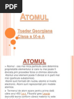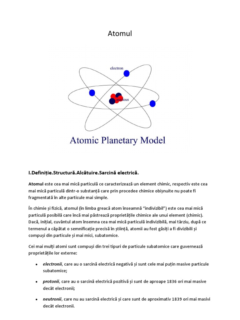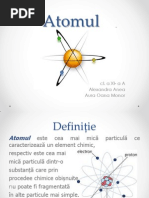 Atomul este cea mai mic particul ce caracterizeaz un element chimic, respectiv este cea mai mic particul dintr-o substan care prin procedee chimice obinuite nu poate fi fragmentat n alte particule mai simple. n chimie i fizic, atomul (n limba greac atom nseamn indivizibil) este cea mai mic particul posibil care nc mai pstreaz proprietile chimice ale unui element (chimic). Dac, iniial, cuvntul atom nsemna cea mai mic particul indivizibil, mai trziu, dup ce termenul a cptat o semnificaie precis n tiin, atomii au fost gsii a fi divizibili i compui din particule i mai mici, subatomice. Cei mai muli atomi sunt compui din trei tipuri de particule subatomice care guverneaz proprietile lor externe: