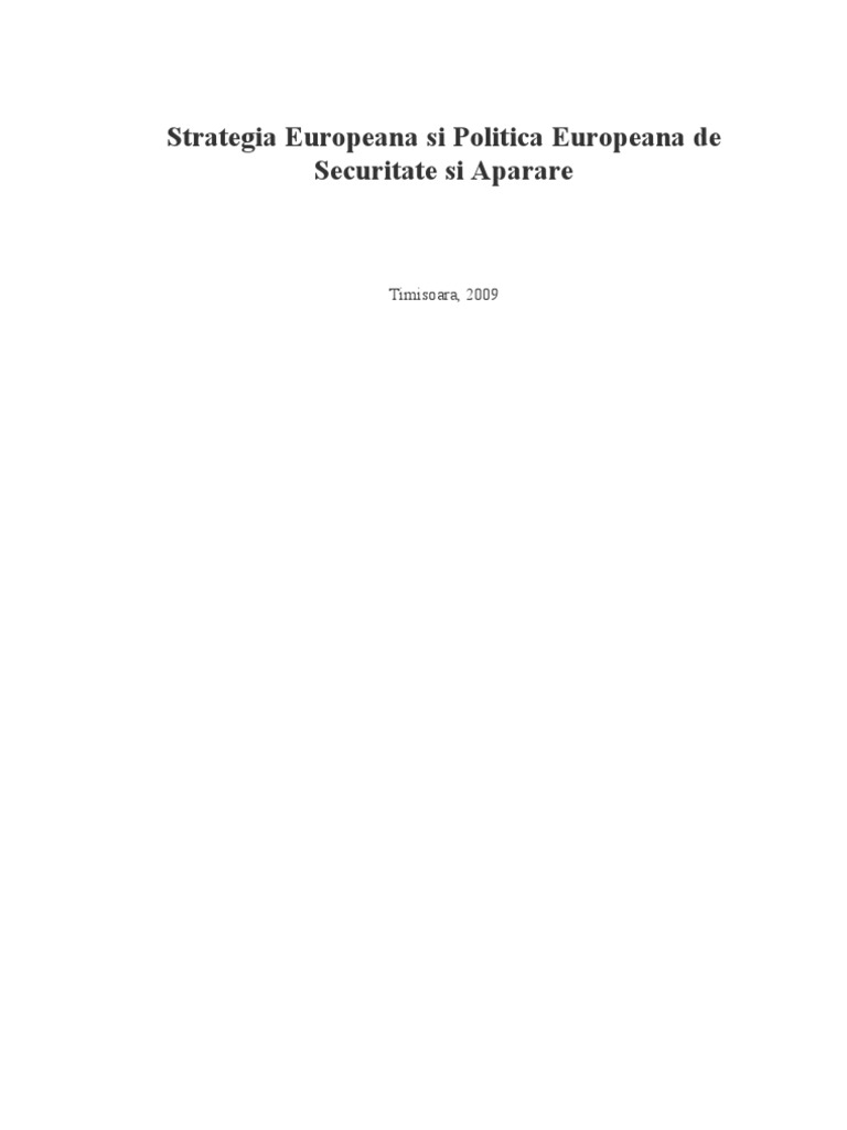 1. Repere generale ale starii actuale de securitate......................3 1.2 Noi amenintari la adresa securitatii internationale - perspectiva europeana.........6 1.3 Posibile raspunsuri la noile provocari......................7 2. Politica Externa si de Securitate si Aparare Comuna (PESAC).................9 2.1 De la Tratatul de la Bruxelles la Actul Unic European ...............9 2.2 Aparitia conceptului Identitate Europeana de Securitate si Aparare ...........10 2.3 Doua noi concepte: Politica Externa si de Securitate Comuna (PESC) si Politica Europeana si de Securitate si Aparare (PESA)...........................11 3. Obiective strategice pentru securitatea europeana..................13