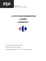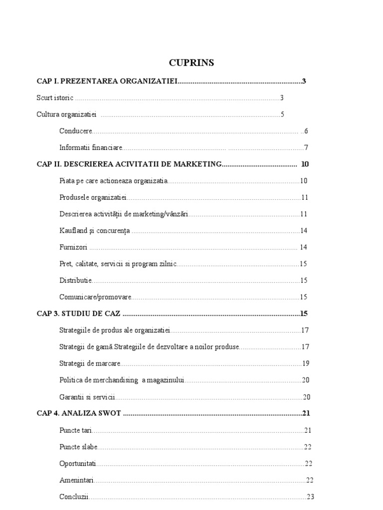 CAP I. PREZENTAREA ORGANIZATIEI..................................................................3 Scurt istoric ............................................................................................................3 Cultura organizatiei ...............................................................................................5 Conducere............................................................................................................. ..6 Informatii financiare....................................................... ........................................7 CAP II. DESCRIEREA ACIVITATII DE MARKETING........................................ 10 Piata pe care actioneaza organizatia......................................................................10 Produsele organizatiei............................................................................................11 Descrierea activitii de marketing/vnzri...........................................................11 Kaufland i concurena .........................................................................................14 Furnizori .............................................................................................................. 14 Pret, calitate, servicii si program zilnic.................................................................15 Distributie..............................................................................................................15 Comunicare/promovare.........................................................................................15 CAP 3. STUDIU DE CAZ ..............................................................................................15 Strategiile de produs ale organizatiei.....................................................................17 Strategii de [Link] de dezvoltare a noilor produse.................................17 Strategii de marcare................................................................................................19 Politica de merchandising a magazinului..............................................................20 Garantii si servicii...................................................................................................20 CAP 4. ANALIZA SWOT ...............................................................................................21 Puncte tari................................................................................................................21 Puncte slabe.............................................................................................................22 Oportunitati..............................................................................................................22 Amenintari................................................................................................................22 Concluzii...................................................................................................................23