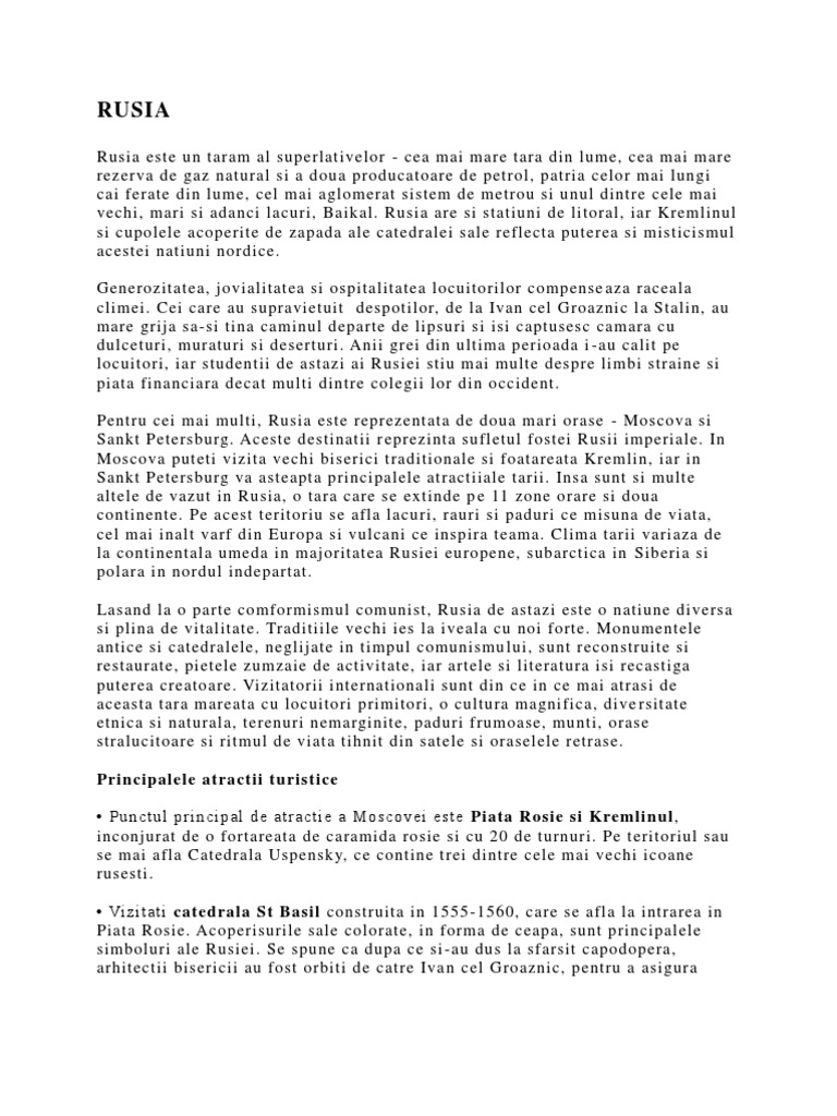 Rusia este un taram al superlativelor - cea mai mare tara din lume, cea mai mare rezerva de gaz natural si a doua producatoare de petrol, patria celor mai lungi cai ferate din lume, cel mai aglomerat sistem de metrou si unul dintre cele mai vechi, mari si adanci lacuri, Baikal. Rusia are si statiuni de litoral, iar Kremlinul si cupolele acoperite de zapada ale catedralei sale reflecta puterea si misticismul acestei natiuni nordice. Generozitatea, jovialitatea si ospitalitatea locuitorilor compense aza raceala climei. Cei care au supravietuit despotilor, de la Ivan cel Groaznic la Stalin, au mare grija sa-si tina caminul departe de lipsuri si isi captusesc camara cu dulceturi, muraturi si deserturi. Anii grei din ultima perioada i -au calit pe locuitori, iar studentii de astazi ai Rusiei stiu mai multe despre limbi straine si piata financiara decat multi dintre colegii lor din occident. Pentru cei mai multi, Rusia este reprezentata de doua mari orase - Moscova si Sankt Petersburg. Aceste destinatii r eprezinta sufletul fostei Rusii imperiale. In Moscova puteti vizita vechi biserici traditionale si foatareata Kremlin, iar in Sankt Petersburg va asteapta principalele atractiiale tarii. Insa sunt si multe altele de vazut in Rusia, o tara care se extinde p e 11 zone orare si doua continente. Pe acest teritoriu se afla lacuri, rauri si paduri ce misuna de viata, cel mai inalt varf din Europa si vulcani ce inspira teama. Clima tarii variaza de la continentala umeda in majoritatea Rusiei europene, subarctica in Siberia si polara in nordul indepartat. Lasand la o parte comformismul comunist, Rusia de astazi este o natiune diversa si plina de vitalitate. Traditiile vechi ies la iveala cu noi forte. Monumentele antice si catedralele, neglijate in timpul comunismu lui, sunt reconstruite si restaurate, pietele zumzaie de activitate, iar artele si literatura isi recastiga puterea creatoare. Vizitatorii internationali sunt din ce in ce mai atrasi de aceasta tara mareata cu locuitori primitori, o cultura magnifica, dive rsitate etnica si naturala, terenuri nemarginite, paduri frumoase, munti, orase stralucitoare si ritmul de viata tihnit din satele si oraselele retrase. Principalele atractii turistice Punctul principal de atractie a Moscovei este Piata Rosie si Kremli nul, inconjurat de o fortareata de caramida rosie si cu 20 de turnuri. Pe teritoriul sau se mai afla Catedrala Uspensky, ce contine trei dintre cele mai vechi icoane rusesti. Vizitati catedrala St Basil construita in 1555 -1560, care se afla la intrarea in Piata Rosie. Acoperisurile sale colorate, in forma de ceapa, sunt principalele simboluri ale Rusiei. Se spune ca dupa ce si -au dus la sfarsit capodopera, arhitectii bisericii au fost orbiti de catre Iva n cel Groaznic, pentru a asigura