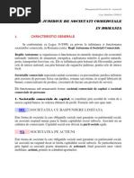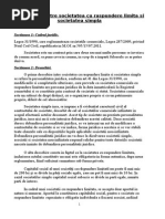 Raspunderea societatii si a actionarilor pentru obligatiile societatii aceleasi reguli ca si la societatea in comandita simpla: comanditatii raspund nelimitat si solidar pentru obligatiile societatii, comanditarii raspund limitat la valoarea aportului adus la capitalul social. Celelalte trasaturi specifice SA sunt valabile si pentru societatea in comandita pe actiuni. In practica, societatea in comandita pe actiuni este o forma cu destule dezavantaje; ea era preferata in sec al XIX-lea, astazi insa are caracter de exceptie. Societatea cu raspundere limitata SRL forma de societate aparuta mai tarziu in activitatea comerciala; prima reglementare a fostin Germania, in 1882; in Romania, a fost reglementata prin Legea 31/1990; Codul comercial roman nu o prevede. Este un hibrid care imbina caractere ale societatii de persoane si ale societatii de capitaluri. Societatile de persoane asigurau conditiile pentru folosirea capitalurilor mici in care prima increderea reciproca intre asociati, iar societatil de capital erau adecvate utilizarii capitalului mare destinat afacerilor de mare anvergura, dar cu raspundere limitata SRL-ul e o societate de persoane, prin aceea ca partile sociale nu sunt reprezentate prin titluri negociabile, nu pot fi cedate unor noi asociati decat daca suntagreati de majoritatea asociatilor. Este si o societate de capitaluri deoarece asociatii aduc un aport social in raport cu care isi limiteaza riscurile. Fiecare asociat va fi tinut pentru datoriile sociale in masura capitalului social subscris. Elemente caracteristice: la baza constituirii societatii sta increderea reciproca a asociatilor (element intuitu personae, apropie acest tip de societate de societatea de persoane) se constituie pe baza contractului de societate si a unui statut, care pot fi incluse in acelasi inscris, cu valoare de act constitutiv; daca exista un singur asociat, se va incheia doar un statut, nu si un contract de societate; legea prevede un numar maxim de asociati, 50;
