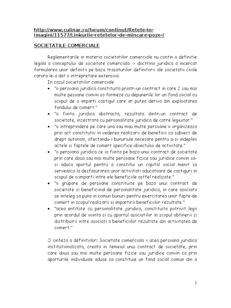 ro/forum/continut/Retete-inimagini/11577/Linkurile-retetelor-de-mincare-poze-/ SOCIETATILE COMERCIALE Reglementarile in materia societatilor comerciale nu contin o definitie legala a conceptului de societate comerciala -> doctrina juridica a incercat formularea unor definitii pe baza trasaturilor definitorii ale societatii civile carora le-a dat o intrepretare extensiva. In cazul societatilor comerciale o persoana juridica constituita printr-un contract in care 2 sau mai multe pesoane convin sa formeze cu depunerile lor un fond social cu scopul de a imparti castigul care ar putea deriva din exploatarea fondului de comert. o fiinta juridica abstracta, rezultata dintr-un contract de societate, inzestrata cu personalitate juridica de catre legiuitor. o intreprindere pe care una sau mau multe persoane o organizeaza prin act constitutiv in vederea realizarii de beneficii ca subiect de drept autonom, afectandu-i bunuriule necesare pentru a-si indeplini actele si faptele de comert specifice obiectului de activitate. o persoana juridica ce ia fiinta pe baza unui contract de societate prin care doua sau mai multe persoane fizice sau juridice convin sasi aduca aportul pentru a constitui un capital social menit sa serveasca la desfasurarea unor activitati aducatoare de castiguri in scopul de a imparti intre ele beneficiile astfel realizate. o grupare de persoane constituite pe baza unui contract de societate si beneficiind de personalitate juridica, in care asociatii se inteleg sa puna in comun bunuri pentru exercitarea unor fapte de comert in scopul realizarii si impartirii beneficiilor rezultate. acea entitate cu personalitate juridica, constituita potrivit legii prin acordul de vointa si cu aportul asociatilor in scopul obtinerii si distribuirii intre asociati a beneficiilor rezultate din activitatea de comert. O sinteza a definitiilor: Societate comerciala = acea persoana juridica institutionalizata, creata in temeiul unui contract de societate, prin care doua sau mai multe persoane fizice sau juridice convin ca prin aporturile individuale aduse sa constituie un fond social comun din a