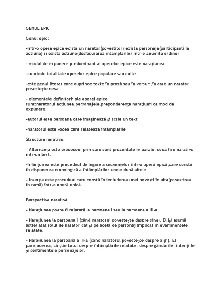 anumita ordine) - modul de expunere predominant al operelor epice este naraiunea. -cuprinde totalitate operelor epice populare sau culte. -este genul literar care cuprinde texte n proz sau n versuri,n care un narator povestete ceva. - elementele definitorii ale operei epice sunt:naratorul,aciunea,personajele,preponderena naraiunii ca mod de expunere. -autorul este persoana care imagineaz i scrie un text. -naratorul este vocea care relateaz ntmplarile Structura narativ: - Alternana este procedeul prin care sunt prezentate n paralel dou fire narative ntr-un text. -nlnuirea este procedeul de legare a secvenelor ntr-o oper epic,care const n dispunerea cronologic a ntmplrilor unele dup altele. - Inseria este procedeul care const n includerea unei poveti n alta(povestirea n ram) ntr-o oper epic. Perspectiva narativ - Naraiunea poate fi relatat la persoana I sau la persoana a III-a. - Naraiunea la persoana I (cnd naratorul povestete despre sine). El i asum astfel att rolul de narator,ct i pe acela de personaj implicat n evenimentele relatate. - Naraiunea la persoana a III-a (cnd naratorul povestete despre alii). El pare,adesea, c tie totul despre ntmplrile relatate, despre gndurile, inteniile i sentimentele personajelor.