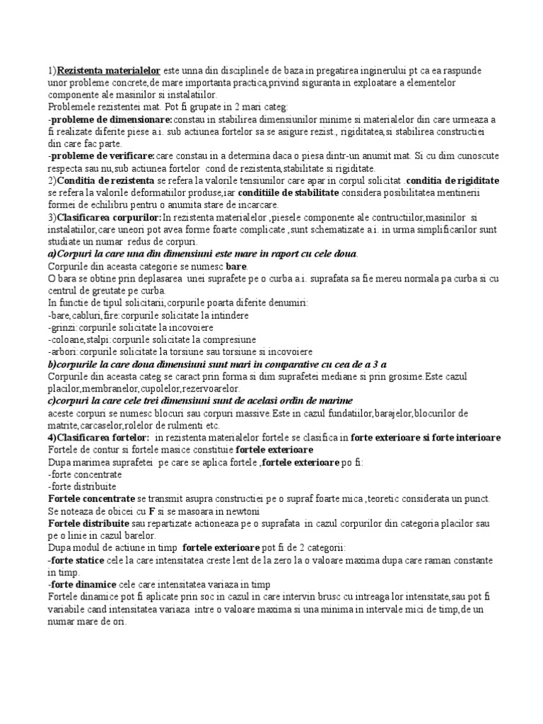 Fortele interioare sunt acele forte care apar in interiorul corpurilor ca urmare a actiunii fortelor exterioare(sarcini) 5)Tipuri de reazeme Legaturile mecanice ideale (fara frecare) ale elementelor de rezistenta se numesc reazeme Aceastea au rolul de a limita posibilitatile de miscare ale corpului [Link] de legatura care se dezvolta in reazeme se numesc reactiuni.;ele sunt reprezentate de forte aplicate in punctele de rezemare pe directiile pe care sunt impiedicate deplasarile si prin momente daca sunt impiedicate rotirile. Tipurile principale de reazeme utilizate in rezistenta materialelor sunt: -reazemul simplu -reazemul articulate -reazemul incastrat Reazemul simplu sau reazemul articulat mobil nu permite deplasarea relative prin translatie a corpurilor aflate in contact dupa directia normalei la planul tangent al acestor corpuri in punctual de contact Reazemul articulate impiedica deplasarea prin translatie a corpului rezemat(a piesei) dupa orice directie in punctual de rezemare ,rotile fiind premise dupa orice axa. Reazemul incastrat impiedica orice translatie si orice rotatie deci suprima sase grade de libertate. Forta axiala N(x) intr-o sectiune transversala oarecare x a unei bare ,este egala cu suma algebrica a proiectiei tuturor fortelor exterioare care actioneaza pe portiunea de baza situata la stanga sau la dreapta sectiunii,pe directia tangentei la axa geometrica a barei in acea sectiune. Forta taietoare Ty(x),Tz(x) intr-o sect transversala oarecare x a unei bare este egala cu suma algebrica a proiectiei tuturor fortelor ext care actioneaza pe portiunea de bara situate la stanga sau la dreapta sectiunii,pe o directie perpendiculara pe tangenta la axa geometrica a barei in acea sectiune Momentul de torsiune Mr(x) intr-o sectiune transversala oarecare x a unei bare este egal cu suma algebrica a proiectiei tuturor mimentelor exterioare care actioneaza pe portiunea de bara situate la stanga sau la dreapta sectiunii pe o directie perpendiculara pe tangenta la axa geometrica a barei in acea sectiune. In functie de numarul eforturilor dintr-o sectiune solicitarile produse de fortele ext pot fi de 2 categorii: Etape pt trasarea diagramei de eforturi -se det reactiunile -se imparte bara pe lungimea ei in regiuni,intervale -pe fiecare regiune se face cate o sectiune oarecare(xi)care se coteaza convenabil -pt fiecare variabila xi se stabileste domeniul sau de definitie a.i. pt valorile lui xi din domeniul de definitie sectiunea sa se poata face numai pe regiunea realizata -in fiecare sect xi se scriu expresiile eforturilor pe baza definitiilor de calcul respective -se reprez graphic func eforturilor pe domeniile de def stabilite -se face verificarea Solicitarea simpla: se produce cand in centrul de greutate al sectiunii apare un singur [Link] felul efortului solicitarile simple sunt: -forfecarea cand exista numai forta taietoare T -rasucirea(torsiunea)cand exista numai momentul de torsiune Mt -incovoierea cand exista numai momentul incovoietor Miy sau Miz Solicitarea compusa: se produce in cazul in care in sectiunea transversala a barei apar doua sau mai multe eforturi. Notiunea de tensiune Limita tensiunii medii pm cand A tinde catre zero p=lim F/A=dF/dA se numeste tensiune in punctual considerat -tensiunea normala () componenta dirijata dupa normala la elemental de suprafata -tensiunea tangentiala() componenta situate in planul elementului de suprafata al sectiunii