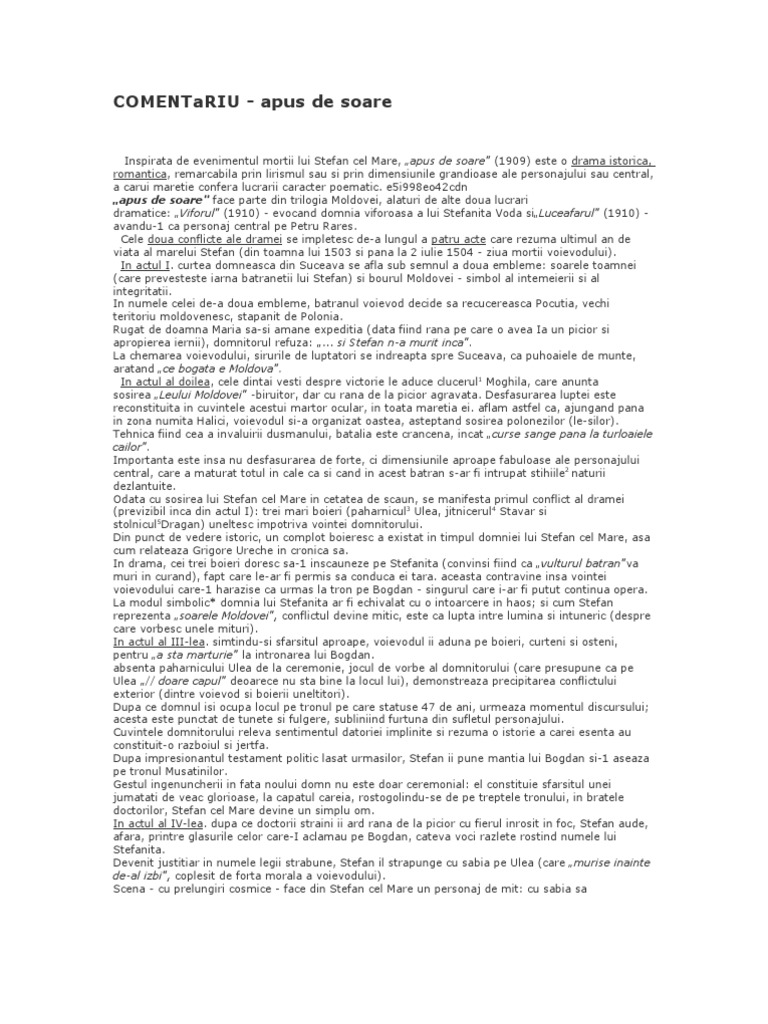 de Barbu Stefanescu Delavrancea Continuand traditia inceputa de V. Alecsandri ( cu drama istorica "Despot- Voda"), urmata de [Link] (cu drama "Razvan si Vidra"), de [Link] (cu nuvela "Alexandru Lapusneanul") si de [Link] (cu nuvelele istorice "Mihnea-Voda cel Rau" si "Doamna Chiajna"), Delavrancea a urmarit - in a sa trilogie a Moldovei - reconstituirea unei epoci istorice indepartate. Aceasta trebuia sa cuprinda sfarsitul domniei lui Stefan cel Mare (evocat in"Apus de soare" ), domnia lui Stefanita-voda ( in "Viforul" ) si cea a lui Petru Rares (in "Luceafarul" ). In 1909 vede lumina rampei drama istorica in patru acte "Apus de soare" , prima piesa a trilogiei . 45633bjo84htd5i Tema: Drama "Apus de soare" are ca tema lupta pentru apararea fiintei nationale in perioada de maxima ascensiune a Moldovei din timpul domniei lui Stefan cel Mare, pe care autorul il aseamana cu un soare. Titlul piesei este metaforic. Metafora "soare" se refera la sistemul social heliocentric : in centrul universului social se afla domnul, iar in jurul sau - in cercuri concentrice - se grupeaza familia, curtea, cetatea si tara. jt633b5484httd Apusul de soare sugereaza trecerea in nefiinta a celui care a fost supranumit "soarele Moldovei". In actul I ideea va fi reluata in cuvintele doamnei Maria, care sintetizeaza domnia lui Stefan:
