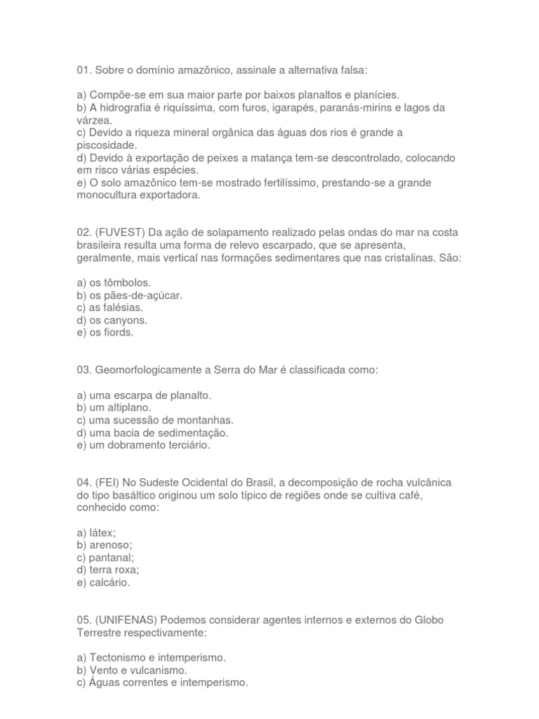 1: (UDESC 2008) Para classificar o relevo, deve-se considerar a atuao conjunta de todos fatores analisados a influncia interna, representada pelo tectonismo, e a atuao do clima, nos diferentes tipos de rocha. Sobre o relevo brasileiro, correto afirmar: