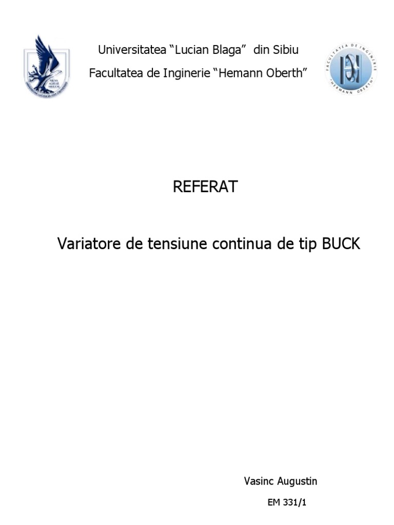 1. Introducere Circuitele de conversie c.c. - c.c (eng. dc - dc) au fost redenumite choppere odat cu apariia comutatoarelor pe siliciu (tiristoare, triace), n engleza - SRC (Silicon Controlled Rectifiers). n prezent, tiristoarele sunt rareori folosite n convertoarele c.c. - c.c., dar se folosesc pe scar larg tranzistoarele bipolare de putere, tranzistoarele MOSFET, i aceste convertoare sunt numite surse de putere n comutaie. Sursele n comutaie pot fi de unul din urmtoarele tipuri: surse n comutaie de tip cobortor. Tensiunea nestabilizat de la intrare este micorata pentru a produce o tensiune continua stabilizat la ieire. Cunoscute cu numele Buck Converter sau Step-Down SMPS. chopper ridictor. Tensiunea nestabilizat de la intrare este crescut pentru a produce o tensiune continu stabilizat la ieire. Cunoscute cu numele de BOOST Converter sau Step-Up SMPS. convertorul fly-back. convertorul mixt. Tensiunea nestabilizat de la intrare este crescut sau micorata pentru a produce o tensiune continua stabilizata la ieire. convertoare rezonante. Aplicaii tipice n care se folosesc surse de putere n comutaie, chopper-ele, sunt: motoare n c.c. ncrctoare pentru baterie. surse de putere Vcc. La convertoarele c.c. - c.c. n comutaie exista cteva particulariti pentru inductanele utilizate, care vor conduce un curent mare la frecvente nalte. Vor fi utilizate fire liate n locul celor rsucite la frecvene mai mari de 50 KHz, cu miezuri magnetice de calitate pentru reducerea pierderilor n miez. De asemenea i condensatoarele sunt solicitate. Acestea lucreaz la frecvente nalte, cu supracureni periodici. Trebuie verificate limitele de curent ale acestora nainte de a fi utilizate. Deci se va atrage o atenie mare asupra parametrilor de lucru ale inductanelor i capacitilor utilizate. n majoritatea circuitelor de putere, diodele joac un rol crucial. O dioda de putere normala este proiectat pentru a lucra la 400 de Hz sau mai puin. n majoritatea invertoarelor i convertoarelor c.c. - c.c. lucreaz la frecvene mult mai nalte i deci aceste circuite necesit diode care sa comute nchis i deschis rapid. n plus, este de dorit ca diodele s nu introduc efect de regim transient la comutaie. De aceea este foarte importanta alegerea corect a diodelor. [Link] Buck(cobortor) - descrierea functionarii Este un circuit electronic care are rolul s furnizeze la ieire o tensiune constant i de valoare mai mic dect tensiunea de alimentare(Valim). Regulatorul n comutaie este utilizat n locul regulatoarelor liniare de tensiune la puteri mari ale sarcinii(la cureni mari) .Odat ce