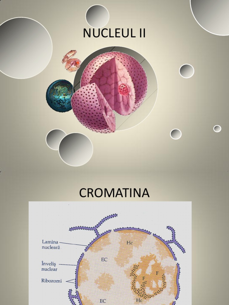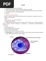Corpuscul intranuclear, interfazic, vital Rol: biogeneza ribozomi Control ciclu celular / diviziune celular In absena lui nu se sintetizeaz proteine/nu diviziune Dimensiuni: 0,5 2 m (> celule sintez proteine) Forma: rotund oval Nu inveli (Nucleolonema) Localizare: central / excentric (poate varia funcional) Numr: 1 10 (medie 2 unul /set haploid) in toate celulele! Vizibil / nu frecvent in afara planului de seciune Compoziie chimic (dupa digestie enzimatic): ADN 3% (ADNaza) ARN 7% (ARNaza) Proteine 90% (proteaze)