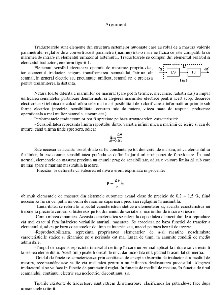 Traductoarele sunt elemente din structura sistemelor automate care au rolul de a masura valorile parametrului reglat si de a converti acest parametru (marime) ntr-o marime fizica ce este compatibila cu marimea de intrare n elementul urmator al sistemului. Traductoarele se compun din elementul sensibil si elementul traductor , conform figurii 1. Elementul sensibil efectueaza operatia de masurare propriu-zisa, iar elementul traductor asigura transformarea semnalului ntr-un alt semnal, n general electric sau pneumatic, unificat, semnal ce e preteaza Fig 1. pentru transmiterea la distanta. Natura foarte diferita a marimilor de masurat (care pot fi termice, mecanice, radiatii s.a.) a impus unificarea semnalelor purtatoare deinformatii si alegerea marimilor electrice pentru acest scop, deoarece electronica si tehnica de calcul ofera cele rnai mari posibilitati de valorificare a informatiilor primite sub forma electrica (precizie, sensibilitate, consum mic de putere, viteza mare de raspuns, prelucrare operationala a mai multor semnale, stocare etc.). Performantele traductoarelor pot fi apreciate pe baza urmatoarelor caracteristici: - Sensibilitatea reprezinta limita raportului dintre variatia infinit mica a marimii de iesire si cea de intrare, cnd ultima tinde spre zero, adica: