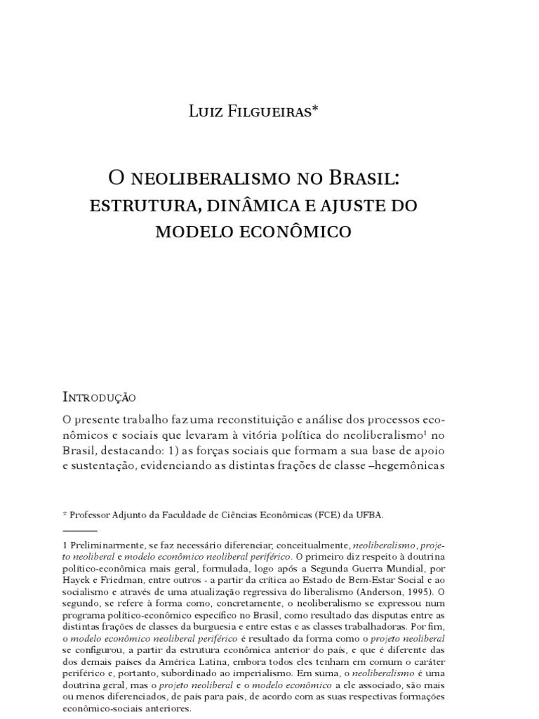 * Professor Adjunto da Faculdade de Cincias Econmicas (FCE) da UFBA. 1 Preliminarmente, se faz necessrio diferenciar, conceitualmente, neoliberalismo, projeto neoliberal e modelo econmico neoliberal perifrico. O primeiro diz respeito doutrina poltico-econmica mais geral, formulada, logo aps a Segunda Guerra Mundial, por Hayek e Friedman, entre outros - a partir da crtica ao Estado de Bem-Estar Social e ao socialismo e atravs de uma atualizao regressiva do liberalismo (Anderson, 1995). O segundo, se refere forma como, concretamente, o neoliberalismo se expressou num programa poltico-econmico especco no Brasil, como resultado das disputas entre as distintas fraes de classes da burguesia e entre estas e as classes trabalhadoras. Por m, o modelo econmico neoliberal perifrico resultado da forma como o projeto neoliberal se congurou, a partir da estrutura econmica anterior do pas, e que diferente das dos demais pases da Amrica Latina, embora todos eles tenham em comum o carter perifrico e, portanto, subordinado ao imperialismo. Em suma, o neoliberalismo uma doutrina geral, mas o projeto neoliberal e o modelo econmico a ele associado, so mais ou menos diferenciados, de pas para pas, de acordo com as suas respectivas formaes econmico-sociais anteriores.