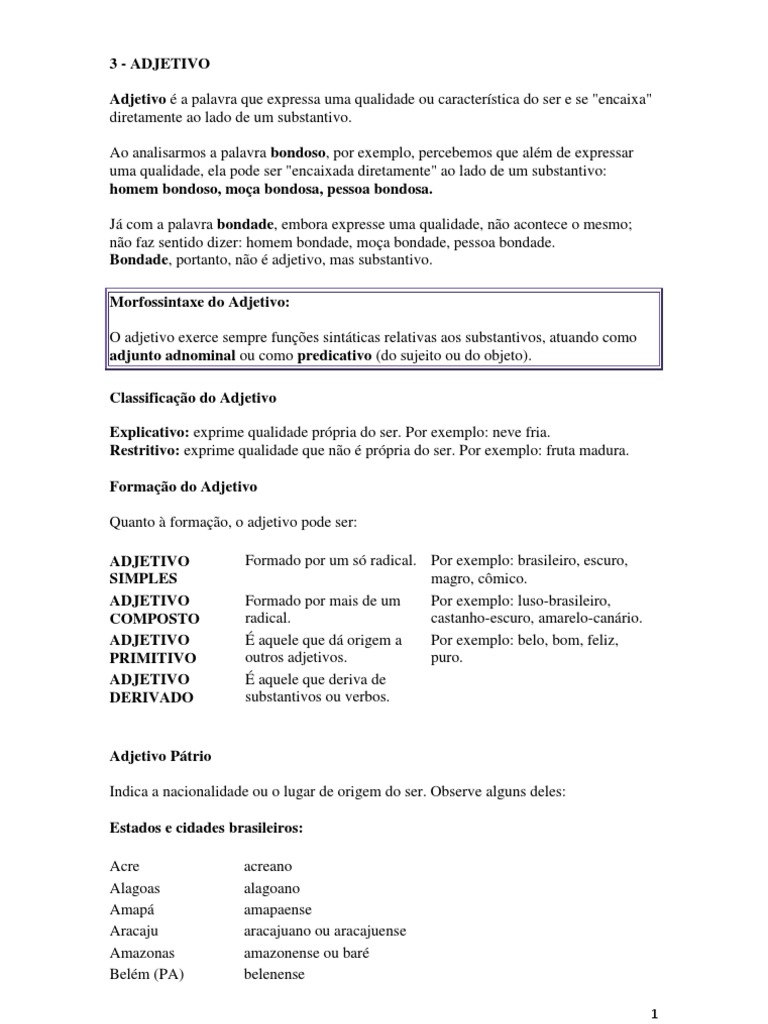 . Ao analisarmos a palavra bondoso, por exemplo, percebemos que alm de expressar uma qualidade, ela pode ser "encaixada diretamente" ao lado de um substantivo: homem bondoso, moa bondosa, pessoa bondosa. J com a palavra bondade, embora expresse uma qualidade, no acontece o mesmo; no faz sentido dizer: homem bondade, moa bondade, pessoa bondade. Bondade, portanto, no adjetivo, mas substantivo. Morfossintaxe do Adjetivo: O adjetivo exerce sempre funes sintticas relativas aos substantivos, atuando como adjunto adnominal ou como predicativo (do sujeito ou do objeto). Classificao do Adjetivo Explicativo: exprime qualidade prpria do ser. Por exemplo: neve fria. Restritivo: exprime qualidade que no prpria do ser. Por exemplo: fruta madura. Formao do Adjetivo Quanto formao, o adjetivo pode ser: ADJETIVO SIMPLES ADJETIVO COMPOSTO ADJETIVO PRIMITIVO ADJETIVO DERIVADO Formado por um s radical. Por exemplo: brasileiro, escuro, magro, cmico. Formado por mais de um Por exemplo: luso-brasileiro, radical. castanho-escuro, amarelo-canrio. aquele que d origem a Por exemplo: belo, bom, feliz, outros adjetivos. puro. aquele que deriva de substantivos ou verbos.