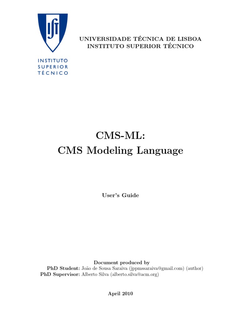 The Model-Driven Engineering paradigm has become increasingly popular due to its usage of models as the main artifacts in the software development process, while artifacts such as documentation and source code can be produced from those models by using automated transformations. On the other hand, we are currently witnessing the rise in popularity of a particular kind of web application, Content Management Systems (CMS), which are already typically regarded as software systems critical to the success of organizational websites and intranets. This documents presents the CMS Modeling Language (CMS-ML), a graphical language for the high-level modeling of CMS-based web applications. CMS-ML is oriented toward enabling non-technical stakeholders to quickly model a web application supported by a CMS system. Furthermore, the language also allows for its extension, in order to address an organizations specic requirements and to support the modeling of more complex web applications. CMS-ML was structured so that it is not mandatory that a single designer have the skills to create both WebSite Template and CMS-based Toolkit models. Although CMS-ML does not dene a modeling approach per se, we consider that CMS-ML models will typically be developed according to the following roles, shown in Figure 1.1: The Toolkit Designer, who models Toolkits; The WebSite Template Designer (usually designated just as Template Designer, for text simplicity), who models a WebSite Template; and The WebSite Creator, who instantiates the various elements dened in the WebSite Template.